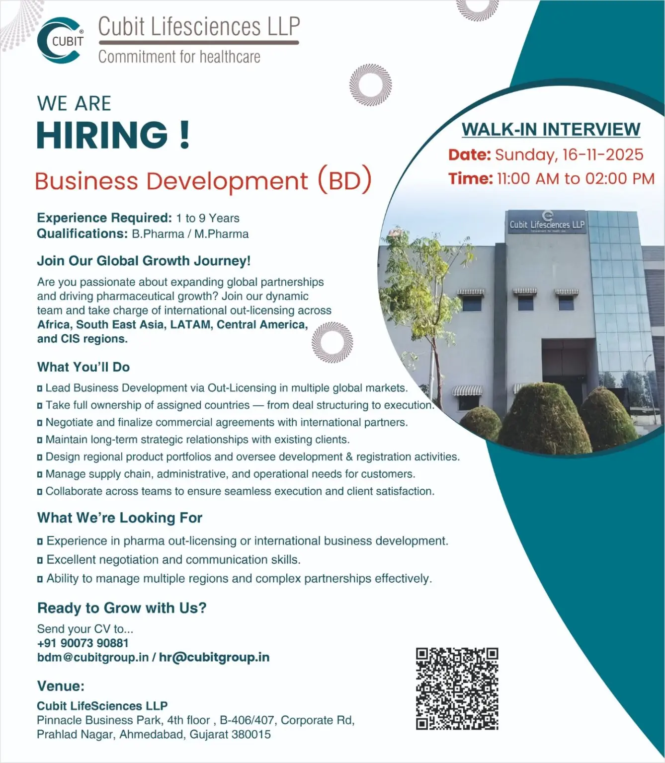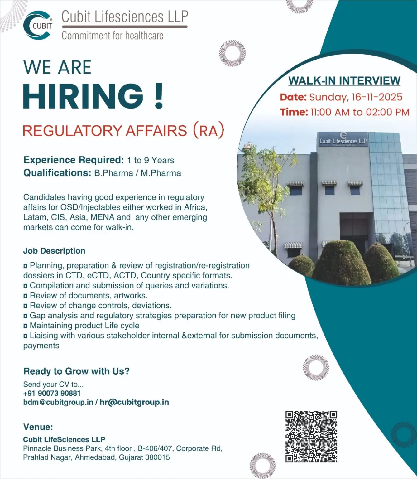 - Walk-in Venue: Cubit Lifesciences LLP, Pinnacle Business Park, 4th floor, B-406/407, Corporate Rd, Prahlad Nagar, Ahmedabad, Gujarat 380015.