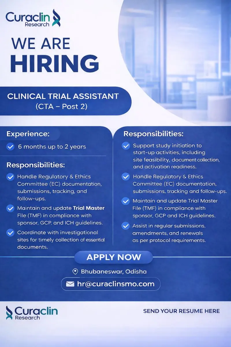 Curaclin Research is hiring Clinical Trial Assistants (CTA) with 2 open positions for candidates with 6 months to 2 years of experience in clinical research operations. This opportunity is based in Bhubaneswar, Odisha and is ideal for early-career professionals looking to build expertise in regulatory documentation, Trial Master File (TMF) management, and study start-up activities. While not a pure fresher role, candidates with internship or short-term experience in clinical trials, GCP compliance, and site coordination are strongly encouraged to apply.