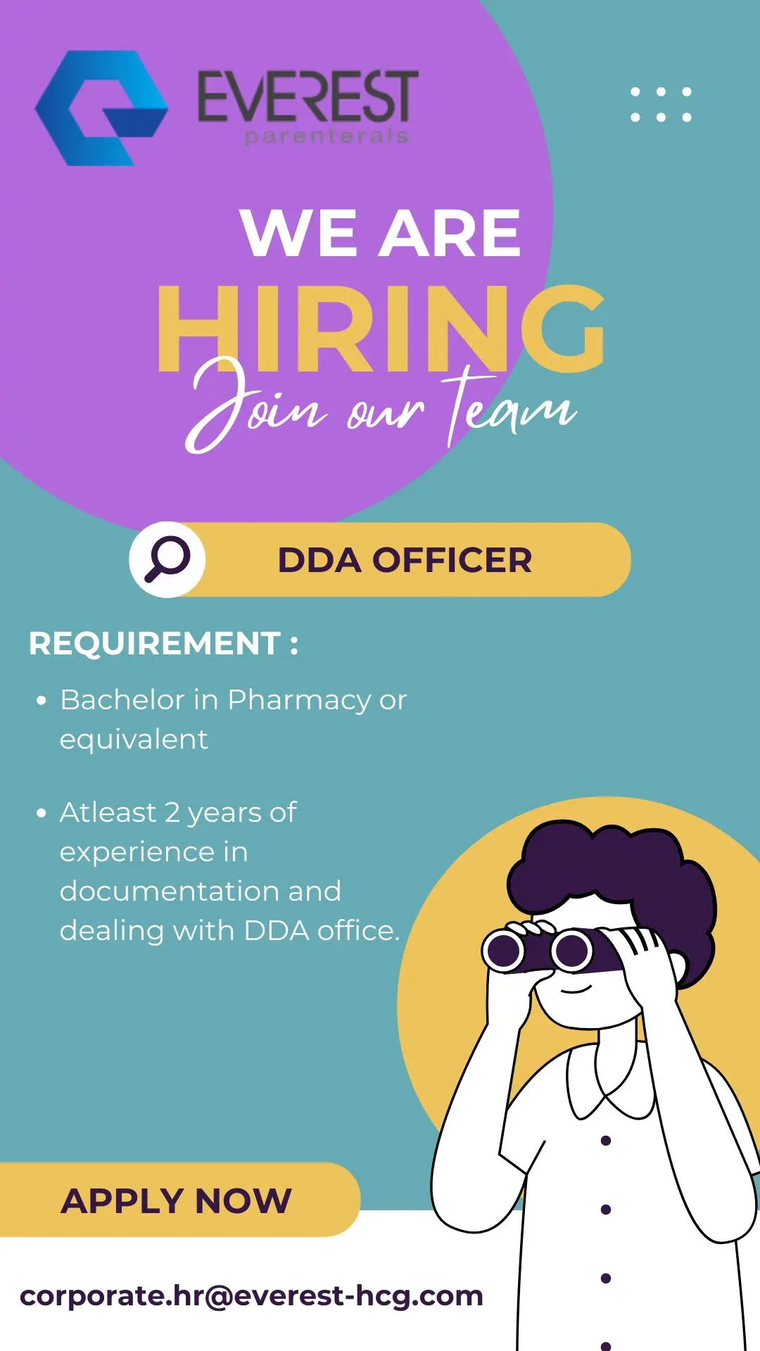 DDA Officer Job for B Pharm Graduates with 2+ Years Experience | Everest Parenterals – Apply Now
