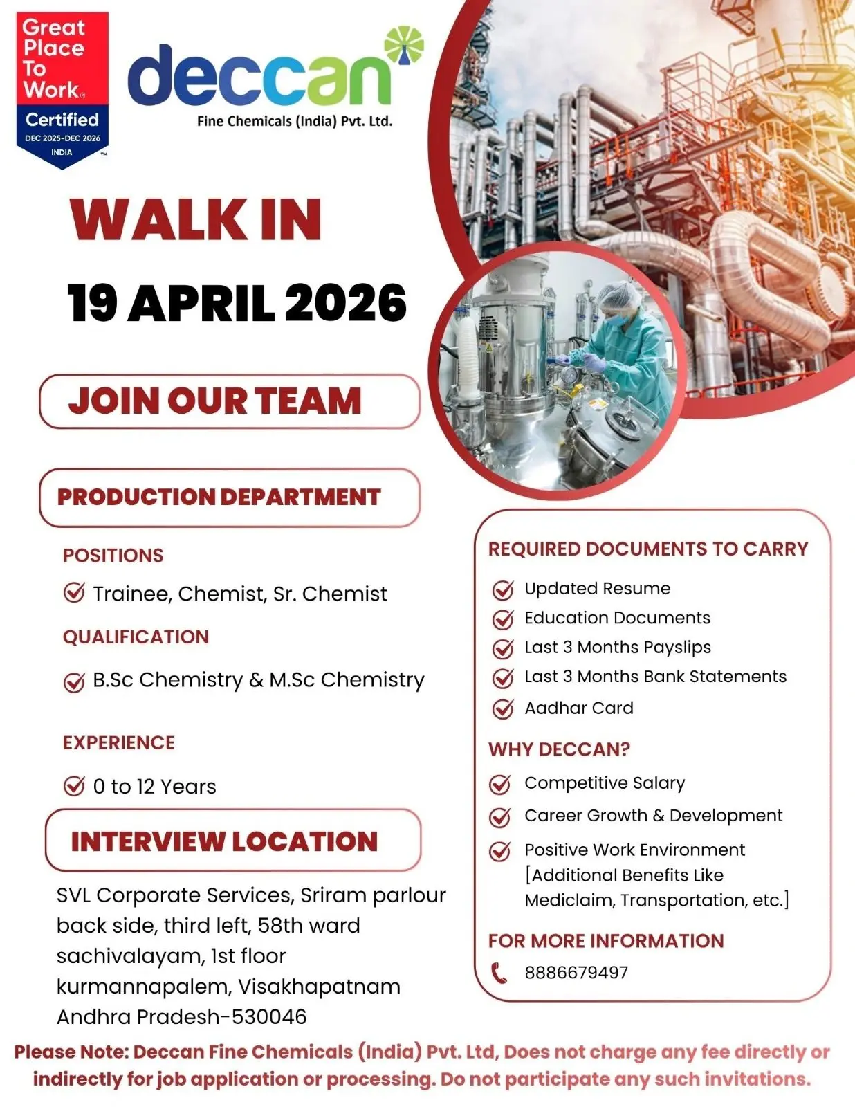 Meta Description: Deccan Fine Chemicals hiring Production roles in Vizag. BSc, MSc Chemistry with 0–12 yrs experience. Walk-in on 19 April.