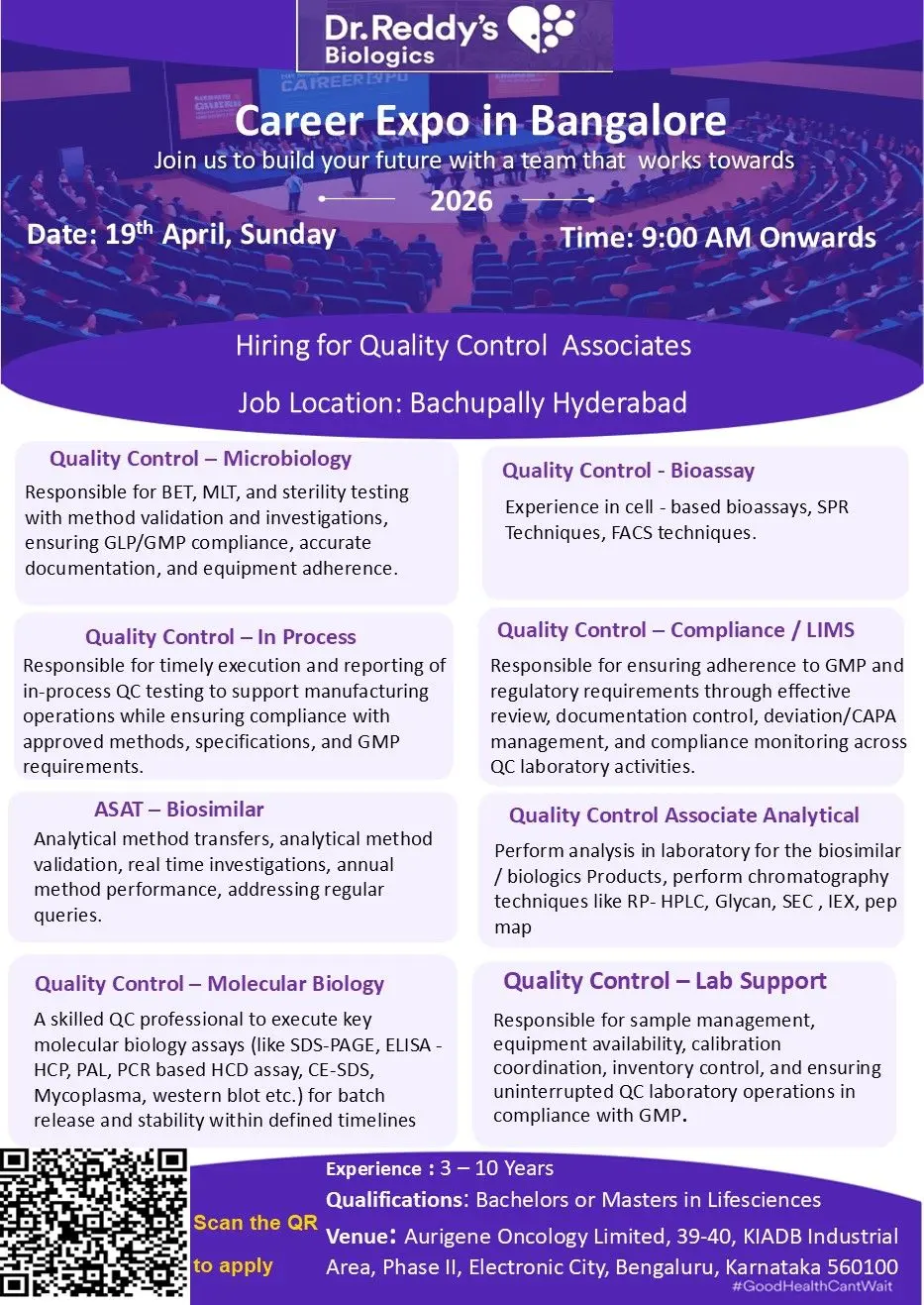 Dr Reddy’s Biologics hiring QA & QC Associates. Life Sciences graduates with 3–10 yrs exp. Walk-in Bangalore April 19.