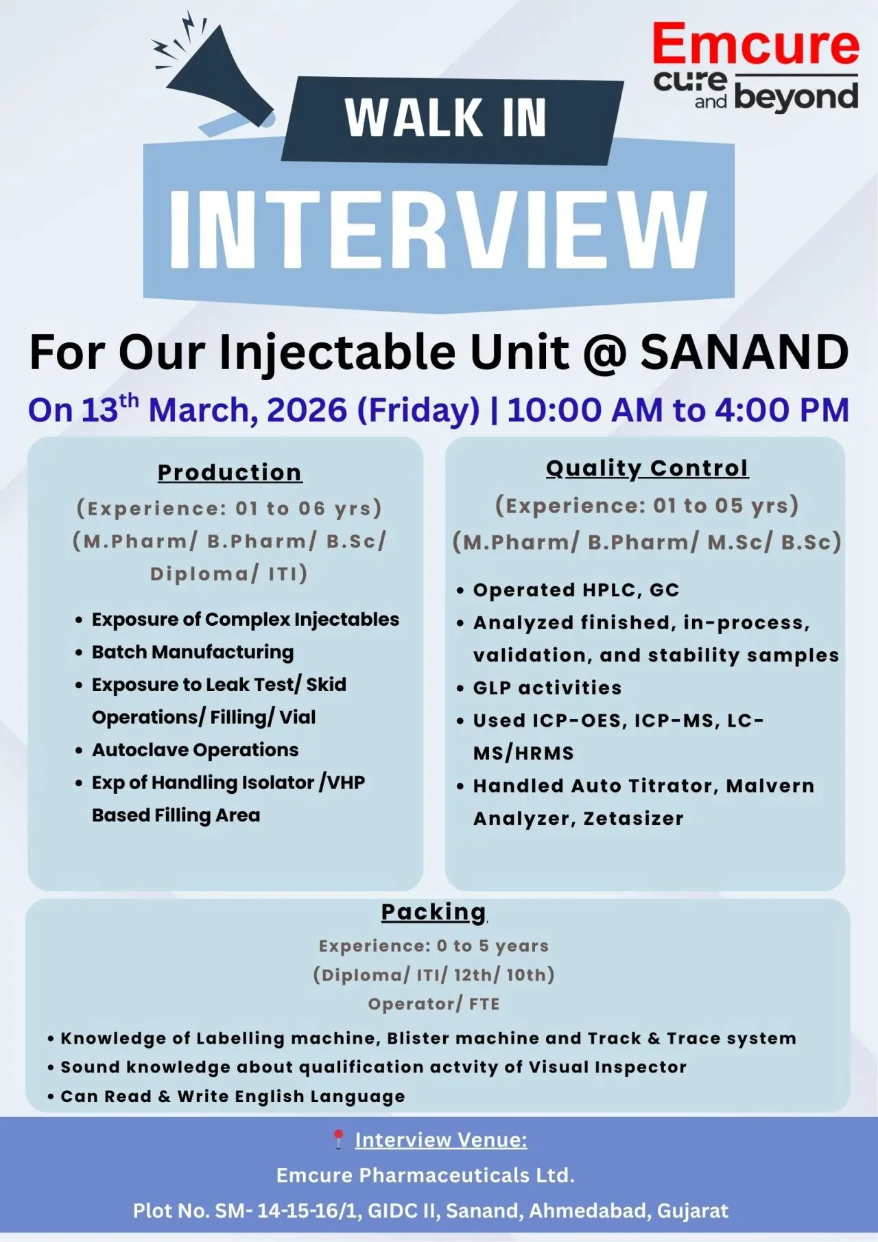 The positions are based at the Emcure Pharmaceuticals injectable manufacturing facility in Sanand, Ahmedabad.