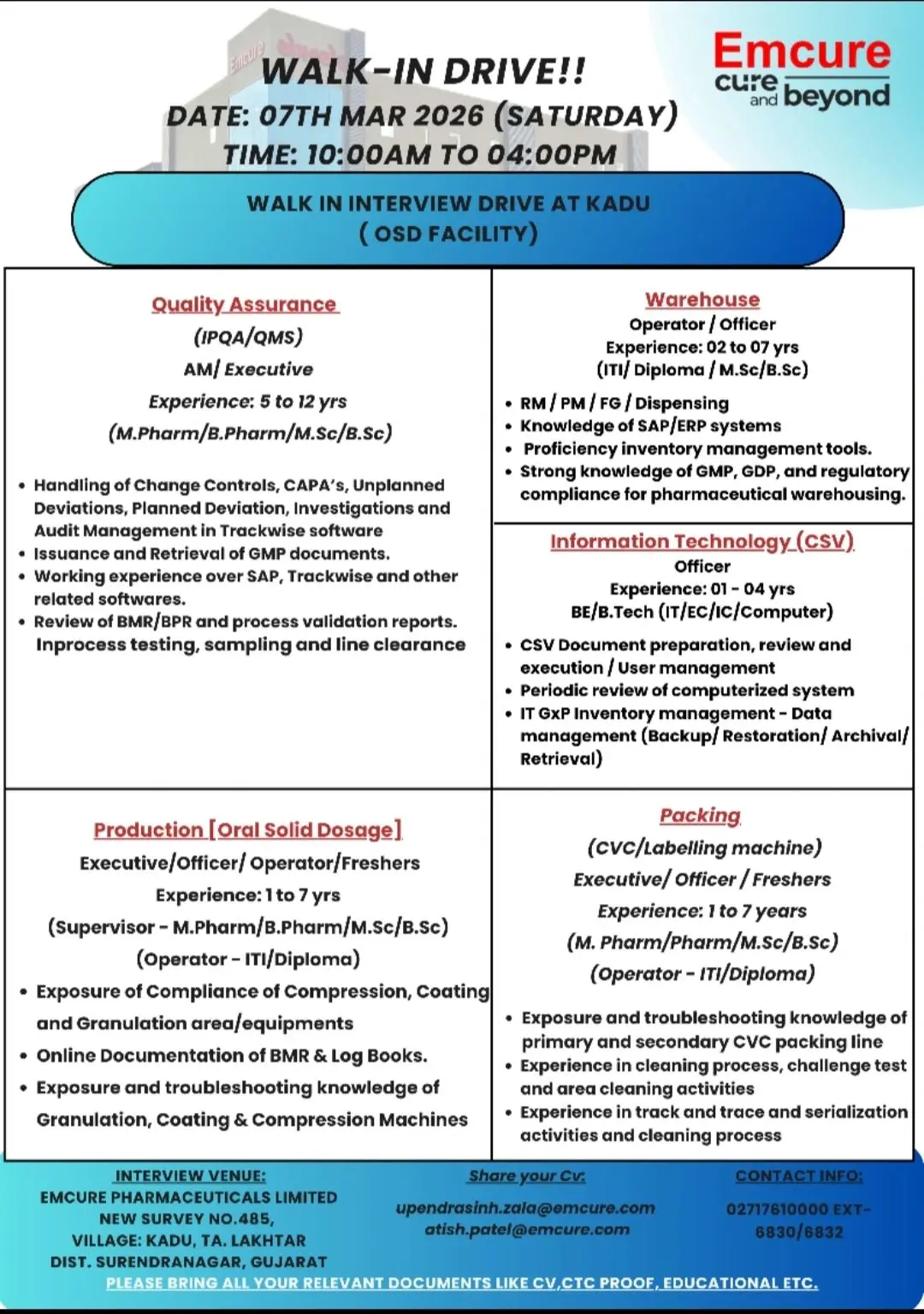 Emcure Pharmaceuticals Limited has announced a large walk-in interview drive at its Oral Solid Dosage (OSD) manufacturing facility in Kadu, Gujarat. This hiring drive covers multiple core pharmaceutical functions including Quality Assurance (IPQA/QMS), Production (OSD), Warehouse, Packing, and Computer System Validation (CSV – IT). The opportunity is ideal for experienced professionals as well as select fresher roles who are seeking stable careers in a regulated, export-oriented pharmaceutical manufacturing environment.