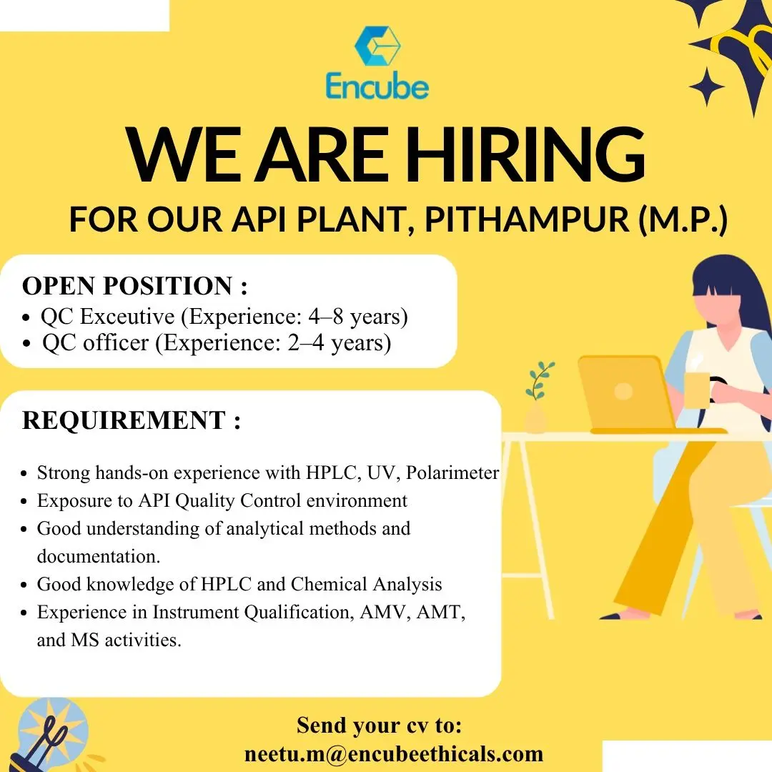 Apply for QC Executive and Officer roles at Encube’s API Plant, Pithampur. 2–8 years experience required. HPLC & analytical skills essential.