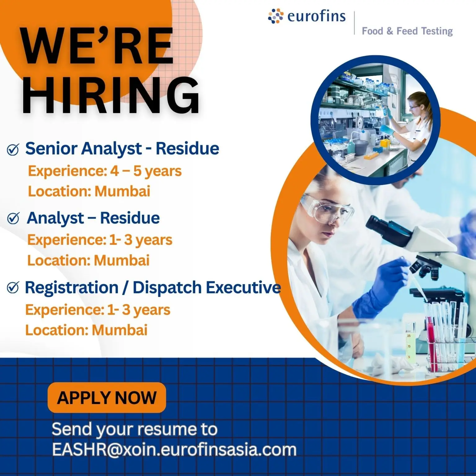 Eurofins hiring Senior Analysts, Analysts & Dispatch Executives in Food & Feed Testing at Mumbai. 1–5 years of experience required.