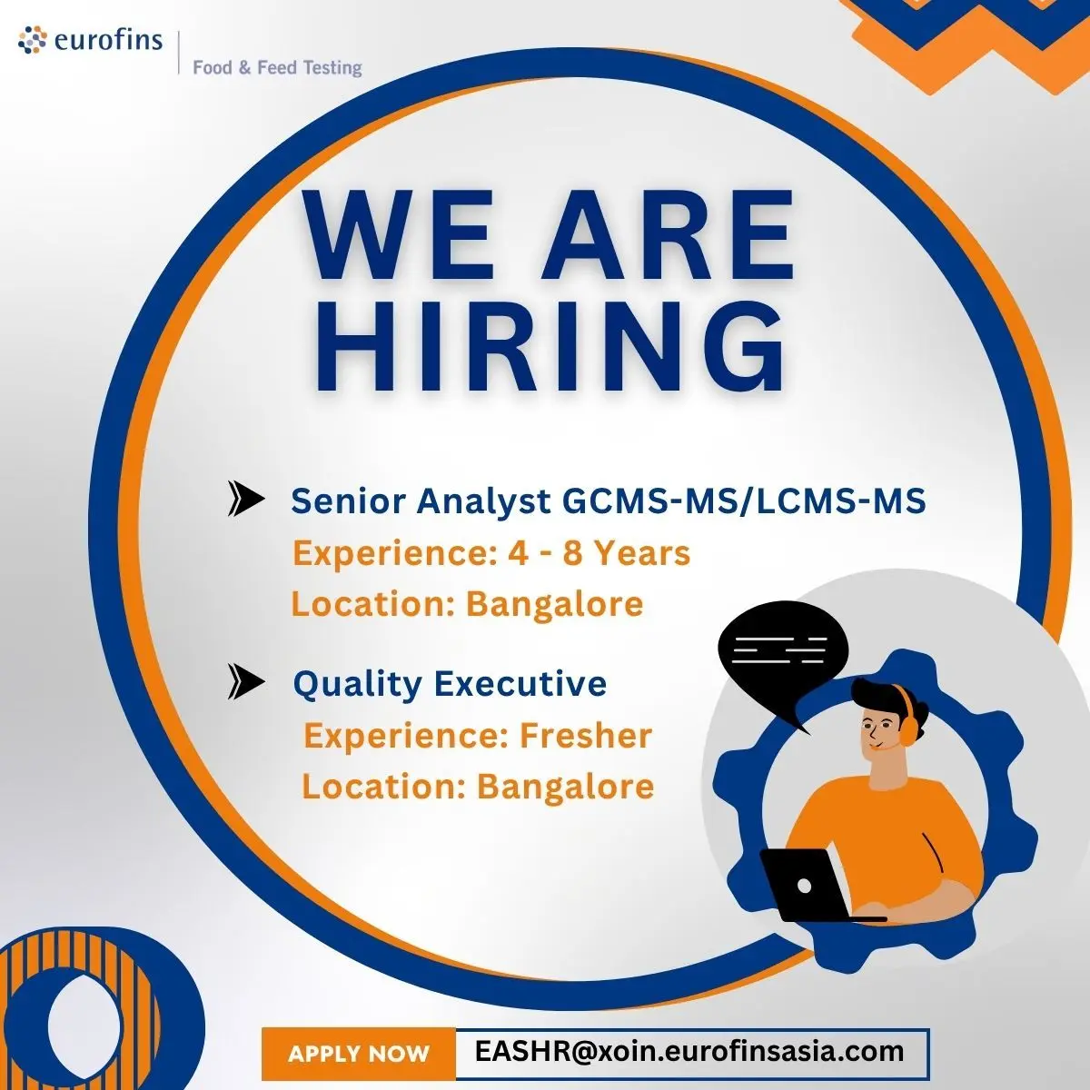 Eurofins hiring Senior Analyst (GCMS-MS/LCMS-MS) 4–8 yrs & QA Executive (Fresher) in Bangalore. Apply now for a rewarding pharma/food testing career.