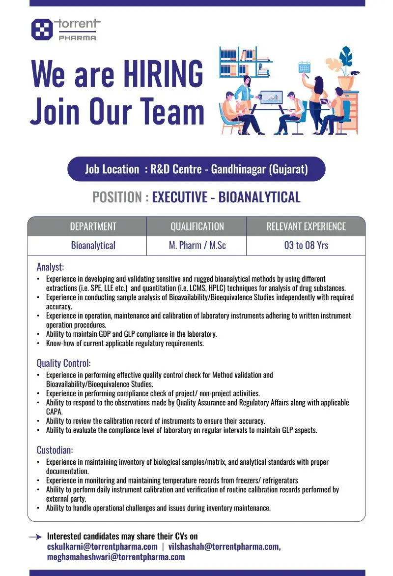 Torrent Pharma hiring Executive – Bioanalytical. M.Pharm/M.Sc candidates with 3–8 years experience. R&D Centre, Gandhinagar.