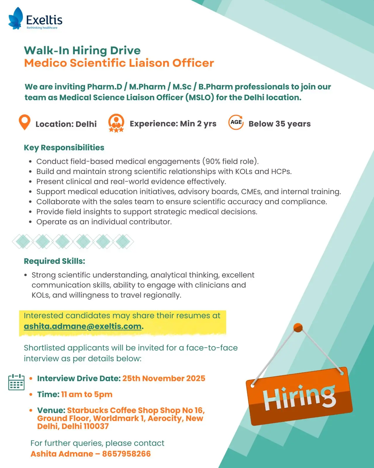 Pharm.D/M.Pharm/M.Sc/MSL openings at Exeltis, Delhi. 2+ yrs experience, field-based role. Walk-in on 25 Nov. Apply now.