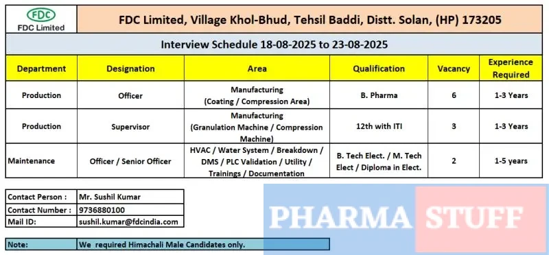 FDC Limited, located in Village Khol-Bhud, Tehsil Baddi, Distt. Solan, Himachal Pradesh, is a leading pharmaceutical company known for its quality formulations and innovative manufacturing processes. These roles offer candidates an opportunity to work in a professional environment with strong career growth prospects.