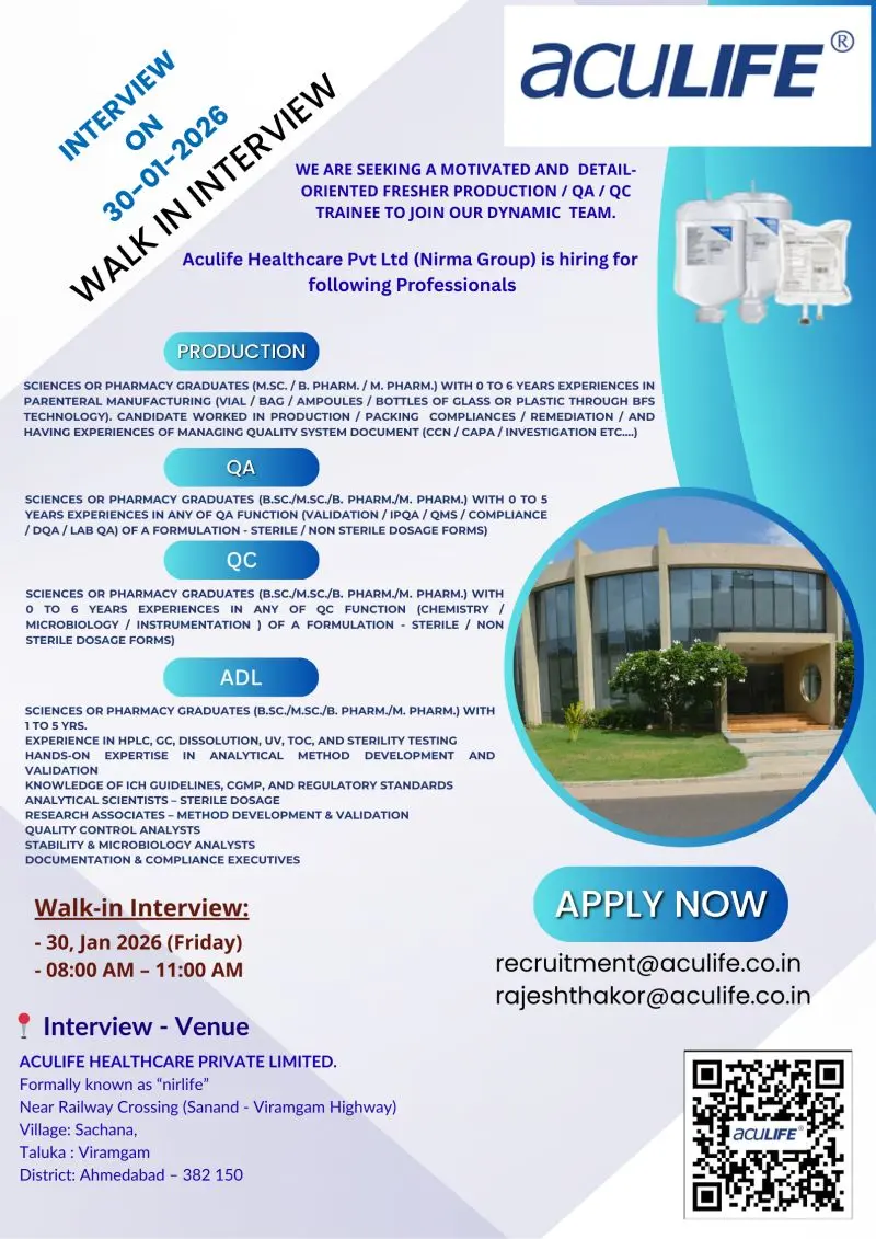 Aculife Healthcare Private Ltd hiring Pharma, QA, QC, Production professionals in Sachana, Ahmedabad. Walk-in interview on 30 Jan 2026.