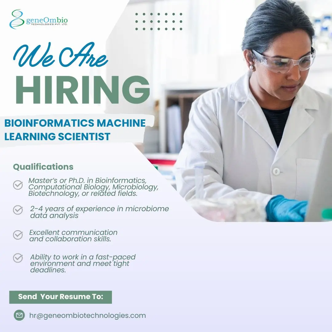 geneOmbio Technologies is hiring Bioinformatics Machine Learning Scientists in Pune. Apply now if you have an MSc/PhD in Bioinformatics, Biotechnology, or Microbiology with 2–4 years’ experience.