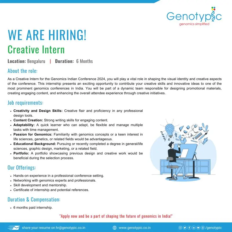 Looking to start your career in life sciences, scientific communication, and event management? Genotypic Technology is hiring Creative Interns for the prestigious Genomics India Conference (GIC) in Bengaluru. This is a 6-month internship designed for students and recent graduates who want hands-on experience in scientific events, branding, and outreach.