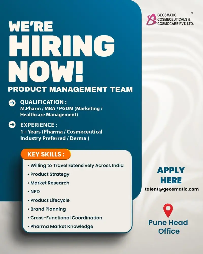 Geosmatic hiring Product Management roles in Pune. MPharm, MBA with 1+ year experience in pharma or cosmeceuticals.