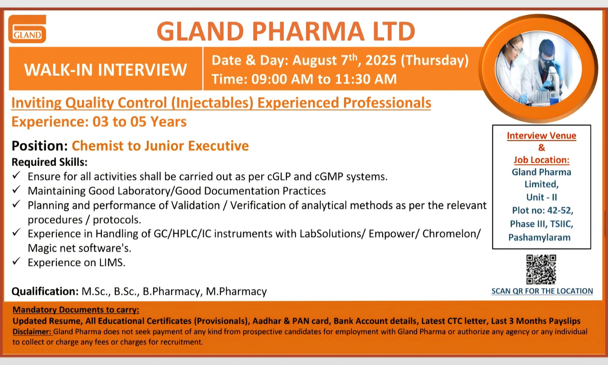 Gland Pharma Ltd is inviting skilled professionals for a walk-in interview for its Quality Control (Injectables) department at Unit-II, Hyderabad. Candidates with a strong foundation in MSc., BSc., B Pharmacy, or M.Pharmacy and 3–5 years of relevant experience in QC for injectables are encouraged to apply.