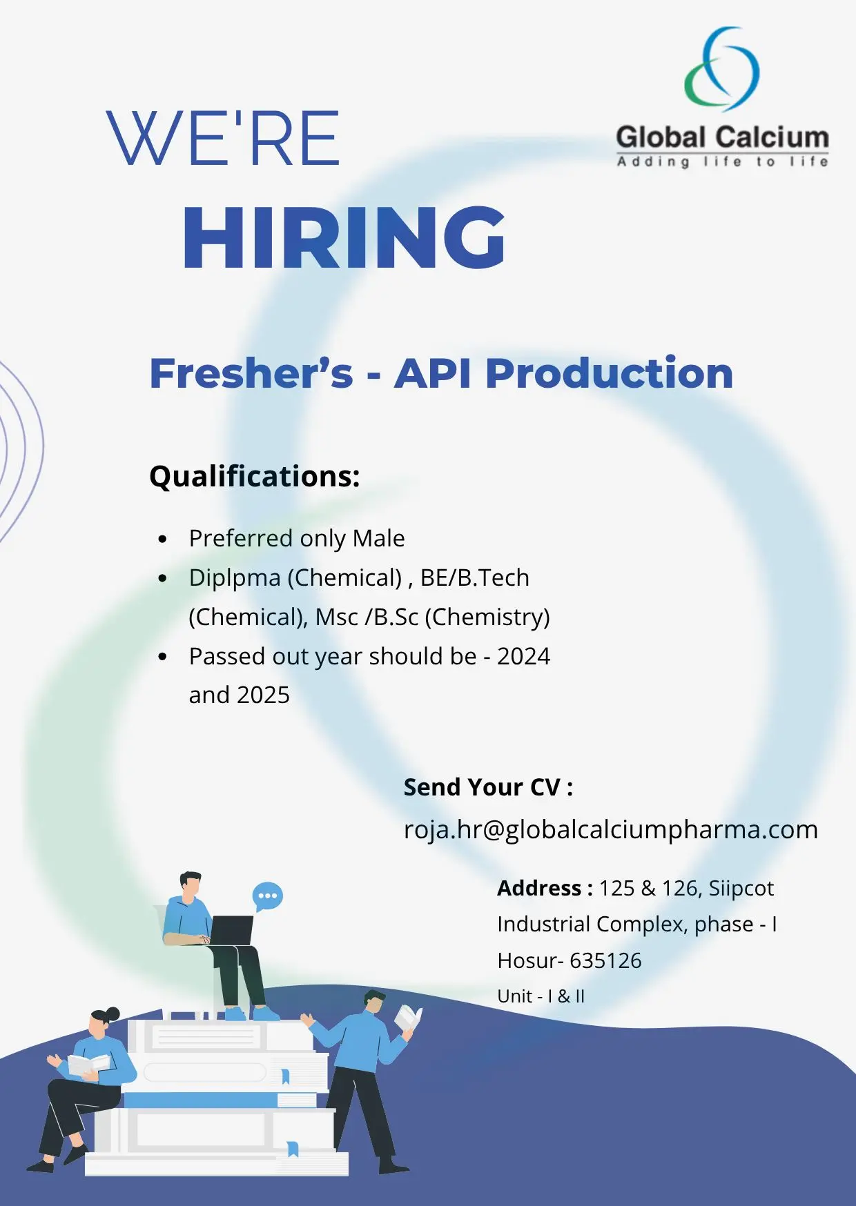 Global Calcium Pvt. Ltd. is inviting applications for multiple fresher vacancies in the API Production department at its Hosur manufacturing facility (Unit I & II). This hiring opportunity is specifically targeted at 2024 and 2025 pass-out candidates from chemistry and chemical engineering backgrounds who are looking to start their careers in pharmaceutical manufacturing.