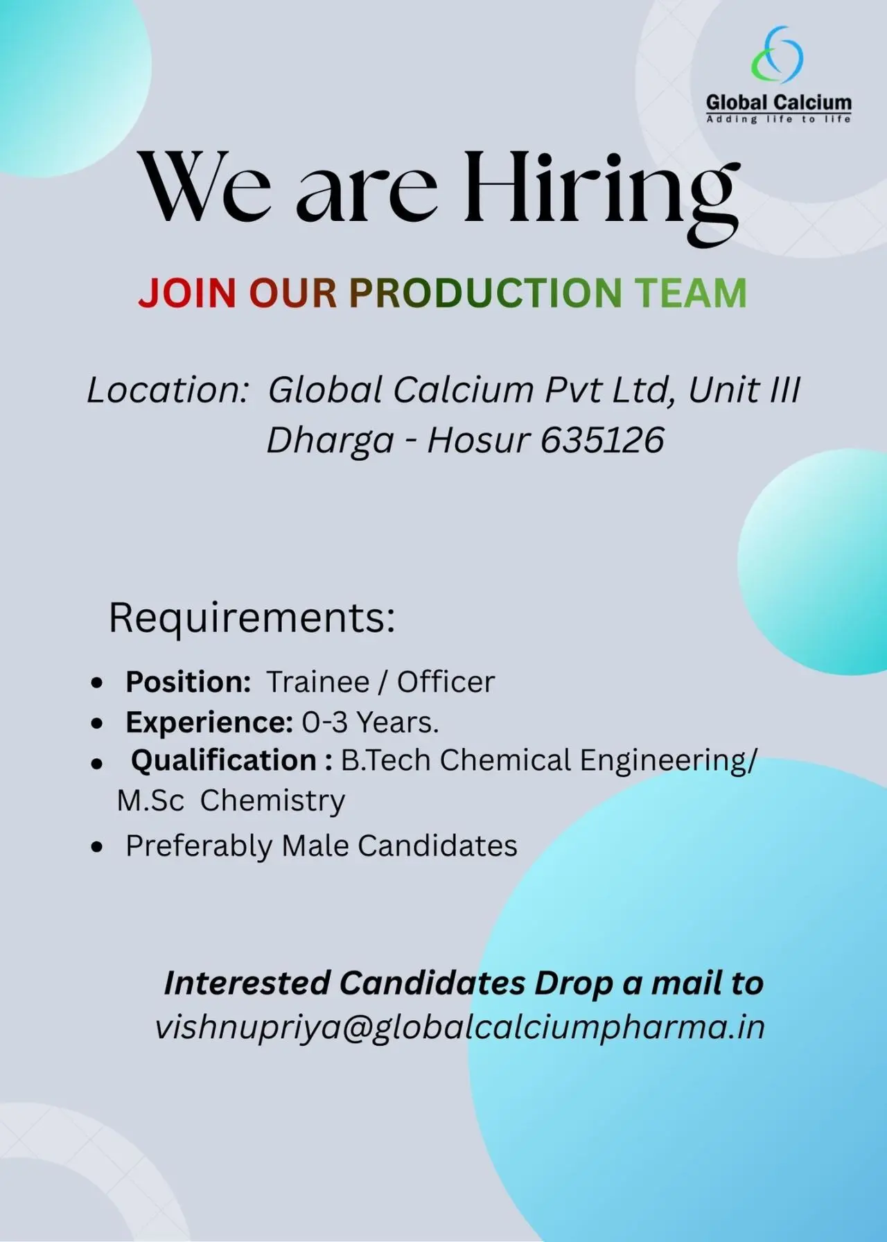 BTech Chemical, MSc Chemistry production vacancies at Global Calcium Hosur. Trainee and Officer roles, 0–3 years experience.