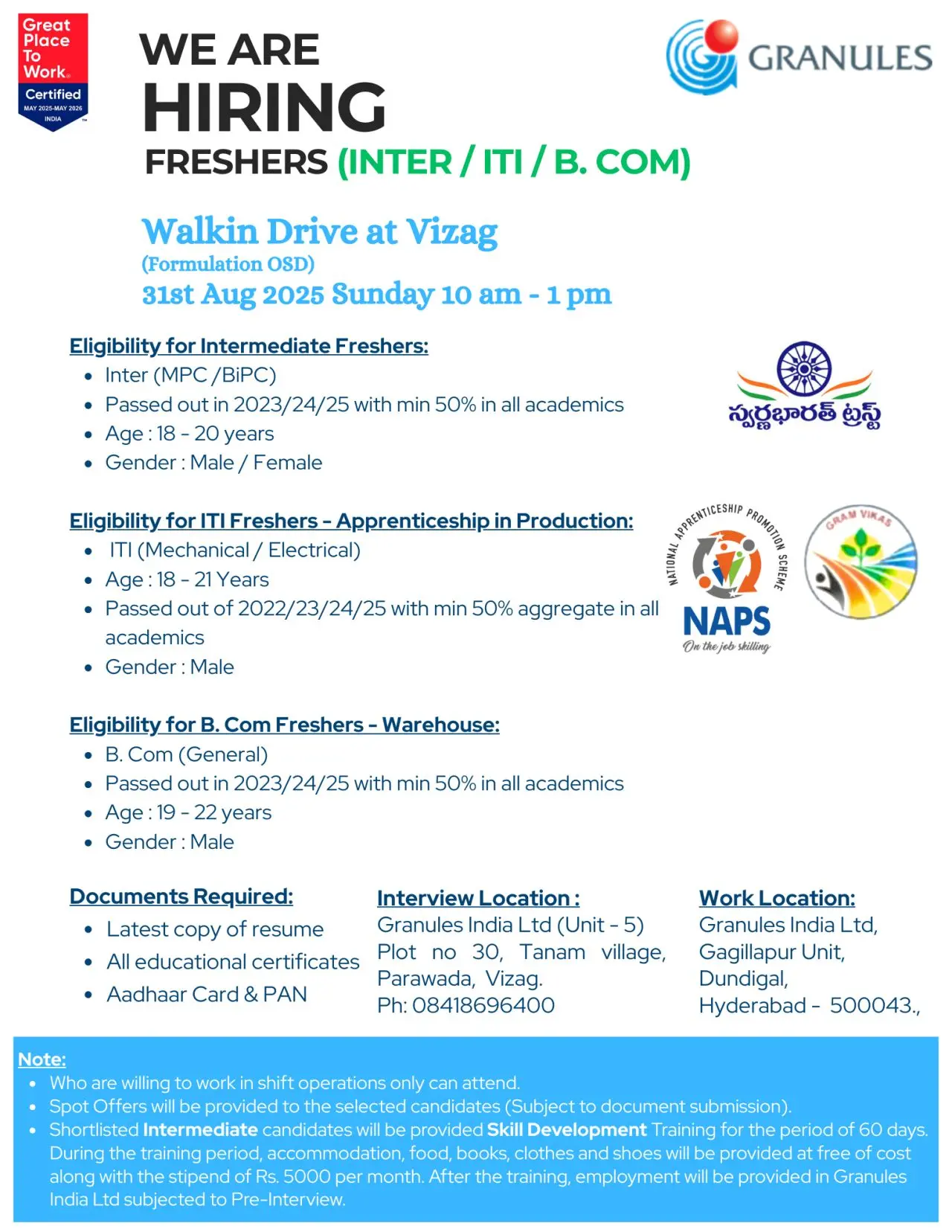 Granules India Ltd., a Great Place to Work Certified organization, is conducting a Walk-In Drive for freshers (Inter/ITI/B.Com) on 31st August 2025 (Sunday) at Vizag. This is an excellent opportunity for young graduates looking to build a career in the pharmaceutical and manufacturing sector. With apprenticeship programs and full-time employment opportunities, Granules India is offering an entry point into one of the fastest-growing pharma companies in India.