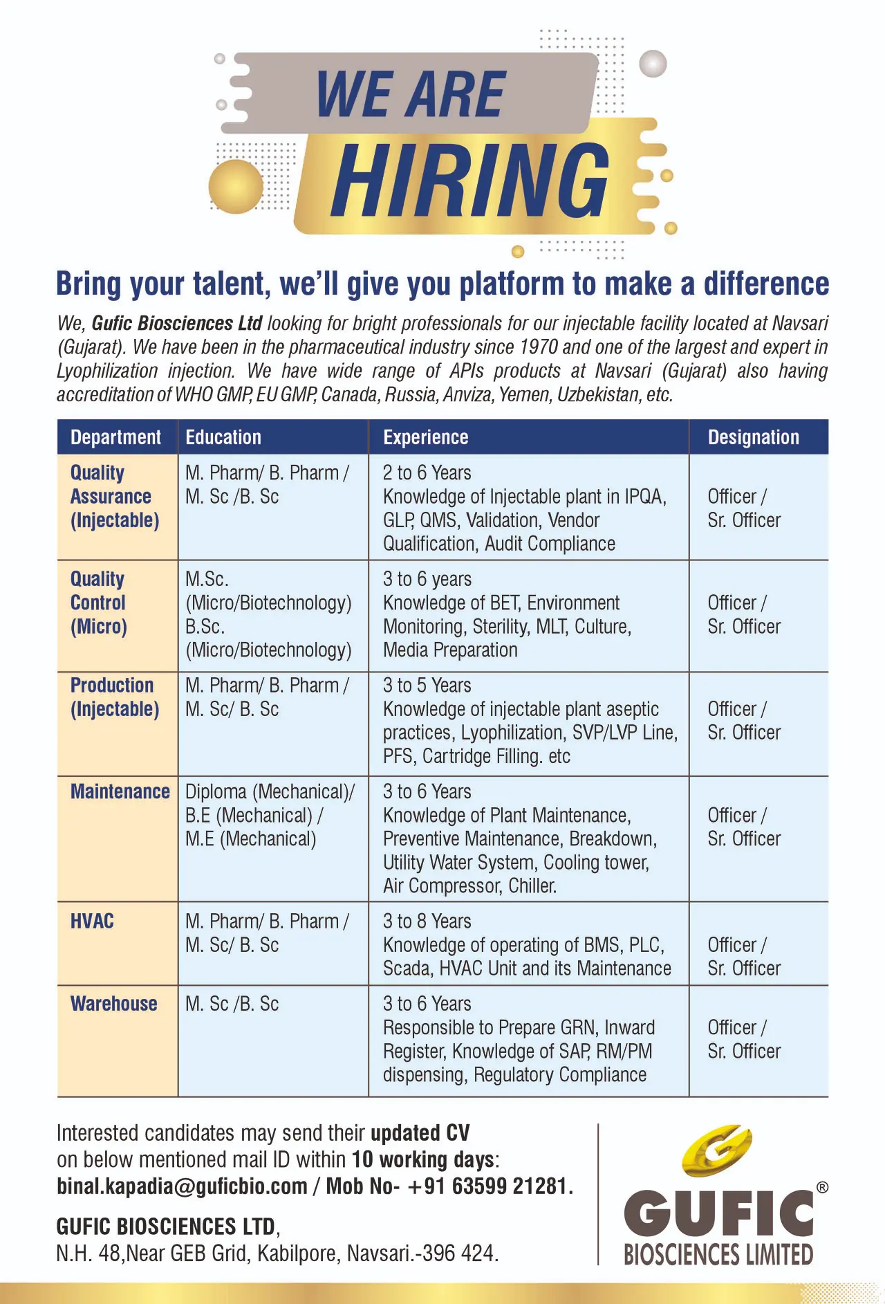 - Job Location: Gufic Biosciences Ltd., Navsari, Gujarat