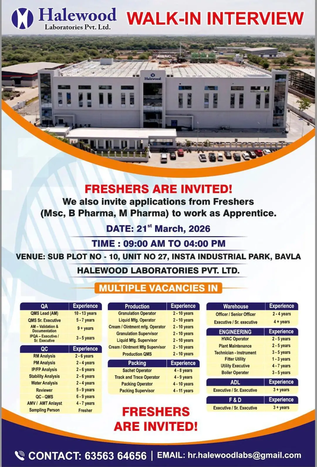 Halewood Laboratories Pvt. Ltd. is conducting a walk-in interview for multiple vacancies across QA, QC, Production, Engineering, Warehouse, and Packaging departments at its Ahmedabad (Bavla) facility. This hiring drive is open to both freshers and experienced professionals, making it a strong opportunity for candidates looking to enter or grow in pharmaceutical manufacturing and quality operations.
