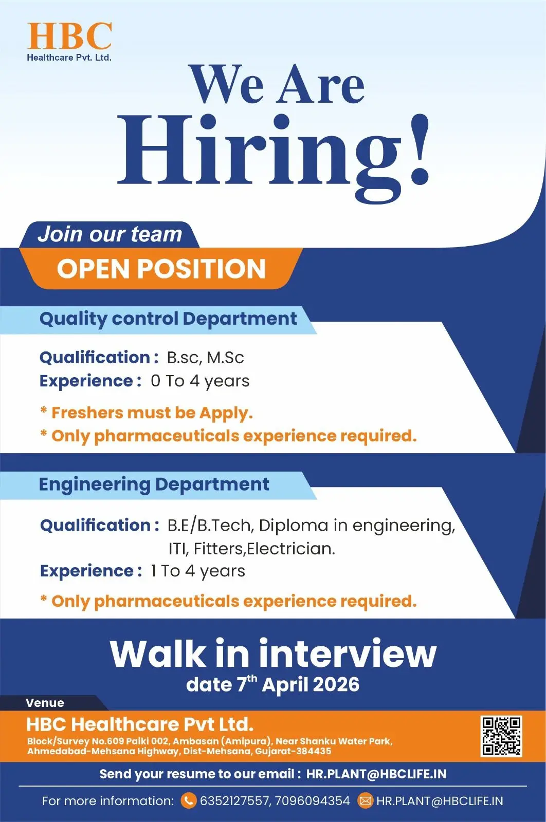 HBC Healthcare Pvt. Ltd. has announced a walk-in drive for multiple openings across the Quality Control (QC) and Engineering departments at its manufacturing facility near Mehsana, Gujarat. The company is hiring B.Sc and M.Sc freshers as well as candidates with up to 4 years of experience for QC roles, along with Engineering professionals (B.E/B.Tech, Diploma, ITI – Fitters and Electricians) with 1 to 4 years of experience.