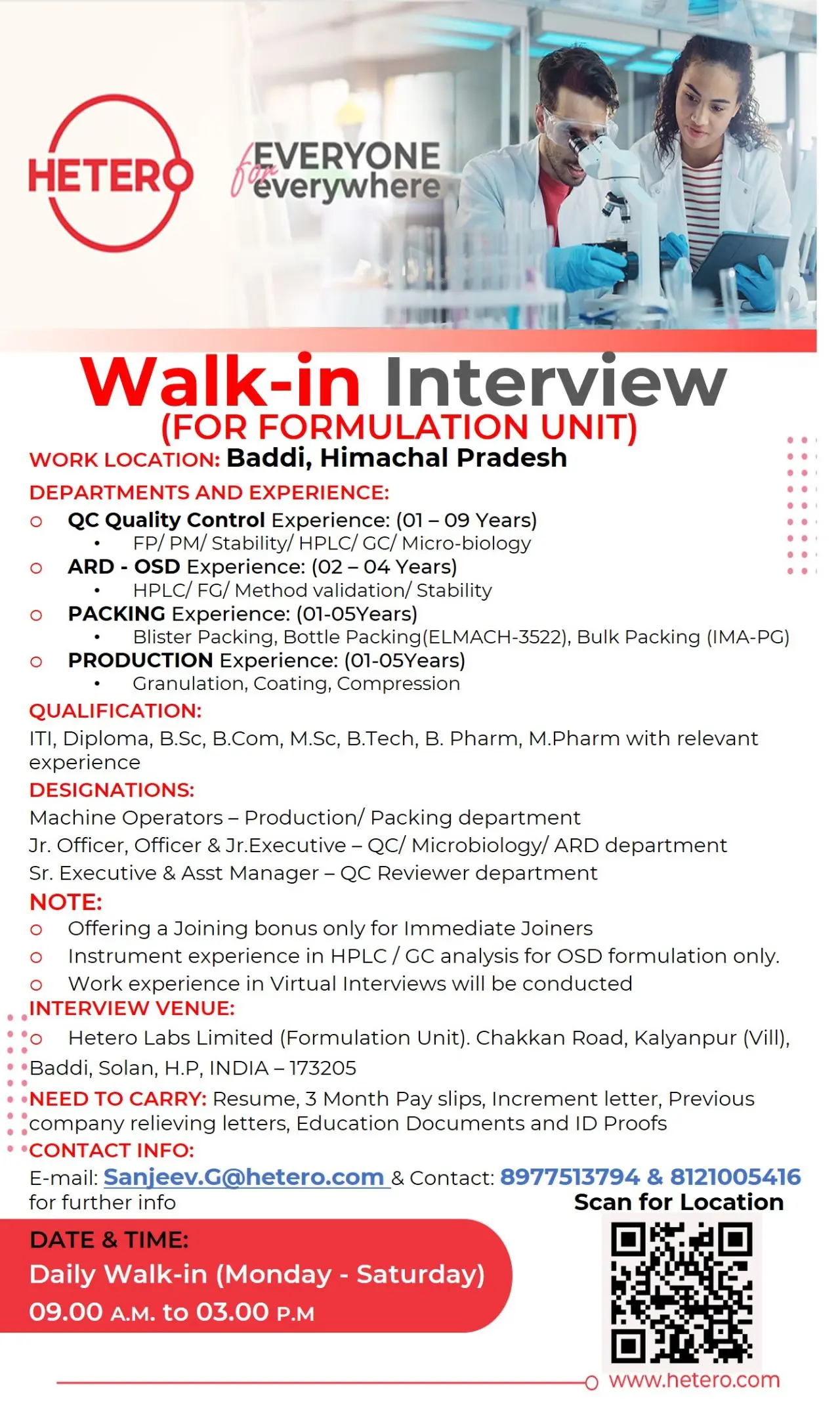 Hetero Labs Limited is conducting daily walk-in interviews for its Formulation Manufacturing Unit located in Baddi, Himachal Pradesh. This hiring drive is focused on strengthening core formulation operations across Quality Control, Analytical Research & Development (ARD), Production, Packing, and Microbiology functions. These opportunities are ideal for candidates with hands-on experience in OSD formulation manufacturing who are looking for stable, long-term careers in a globally regulated pharmaceutical environment.