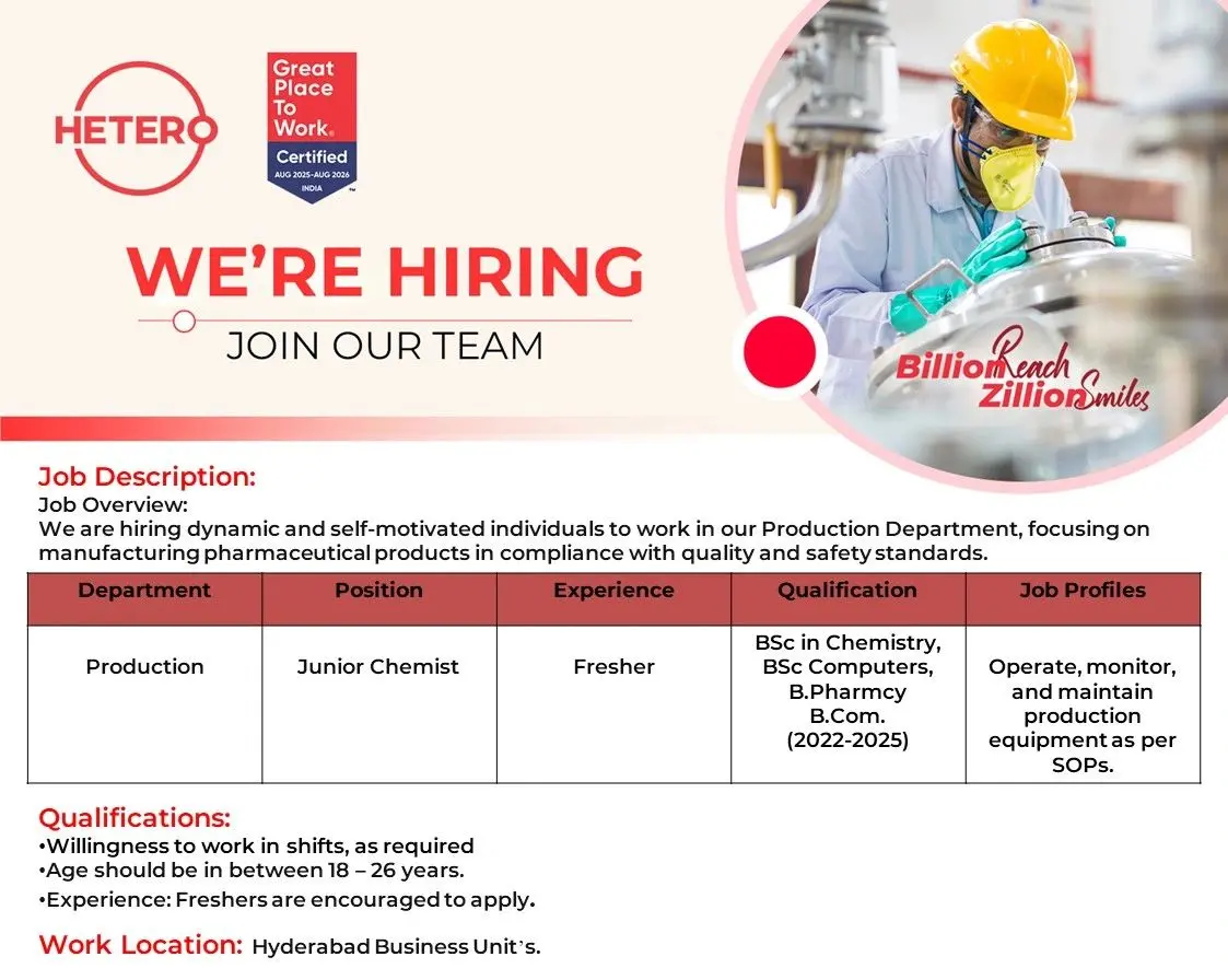 Hetero, a globally recognized pharmaceutical company and certified Great Place to Work (2025–2026), has announced freshers hiring for the Production Department at its Hyderabad business units. The company is offering Junior Chemist roles specifically designed for recent graduates from 2022 to 2025 batches, making this an excellent entry-level opportunity in pharmaceutical manufacturing.