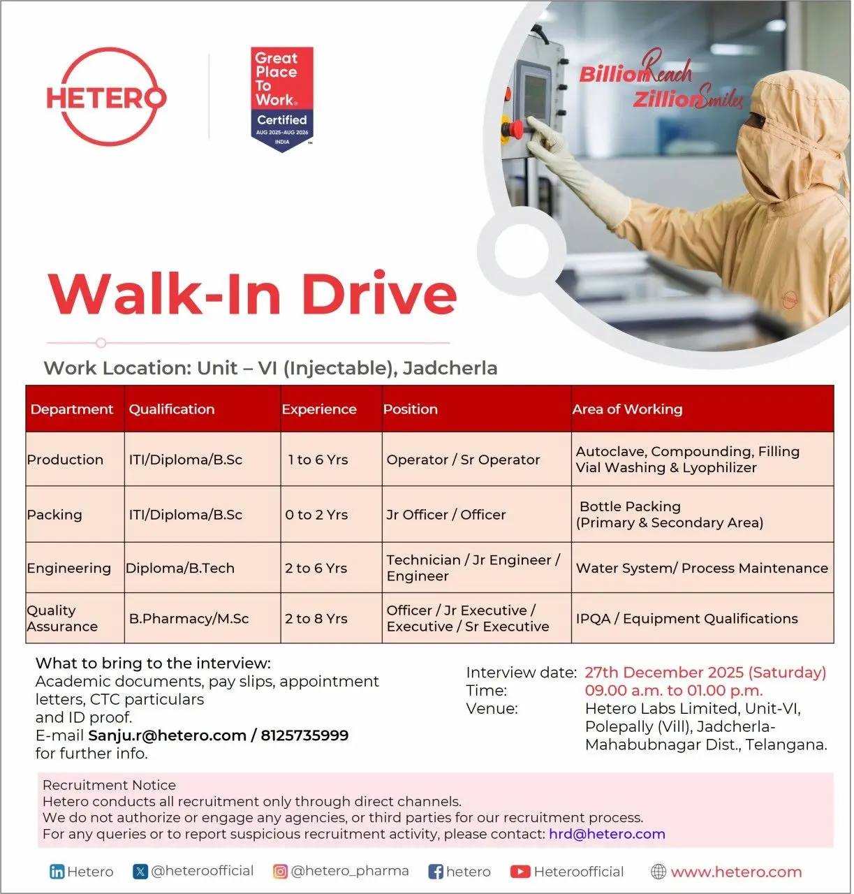 Hetero Labs hiring Production, QA, Engineering roles at Jadcherla. ITI, Diploma, BSc, BPharm eligible. Walk-in interview Dec 27.