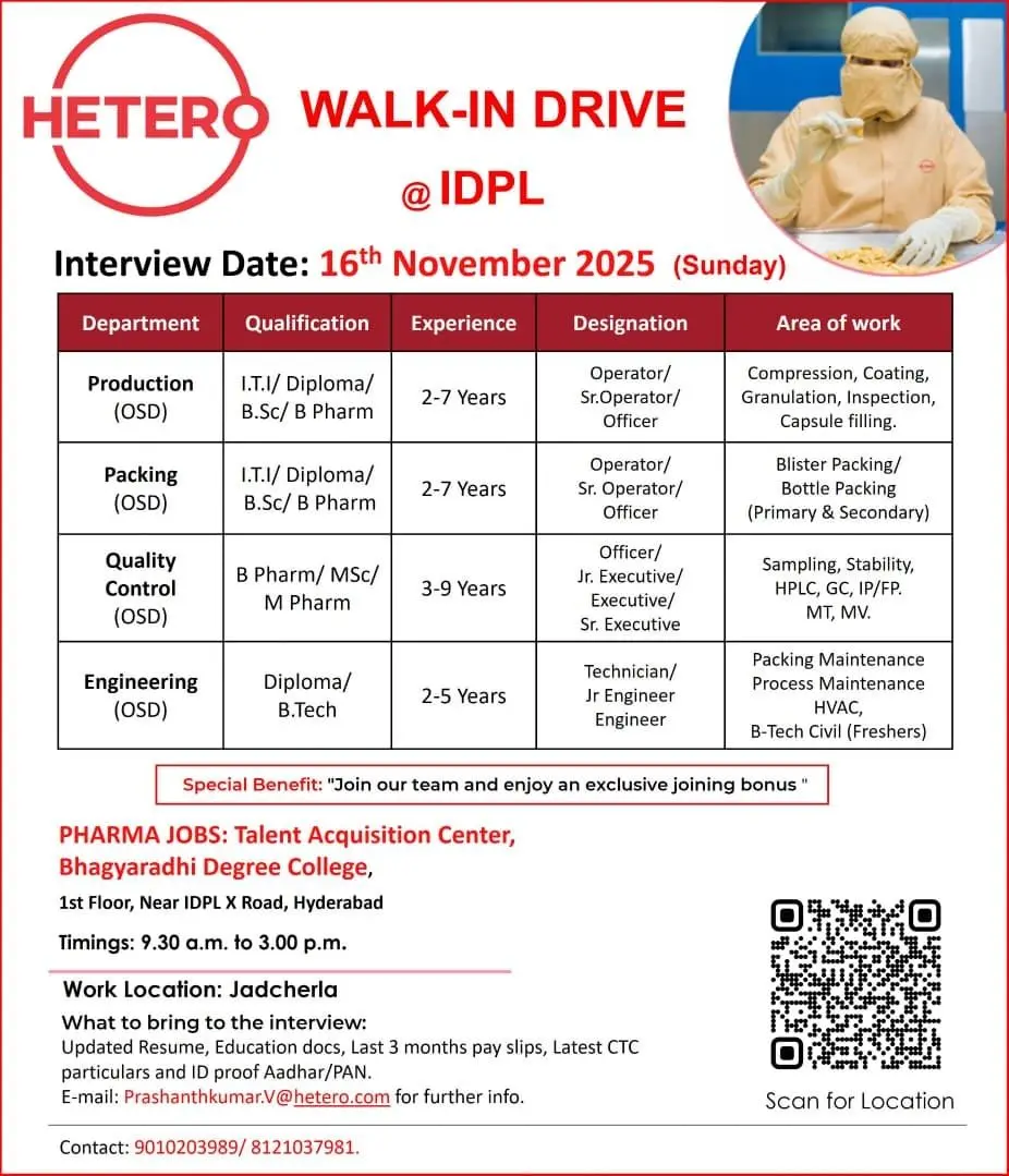 Hetero Labs Ltd., one of India’s top pharmaceutical organizations, is conducting a walk-in drive for its OSD (Oral Solid Dosage) manufacturing facility at Jadcherla. The drive will be held on 16th November 2025 (Sunday) at Hyderabad. Openings are available across Production, Quality Control, Packing, and Engineering departments for candidates with relevant experience in regulated pharmaceutical plants.