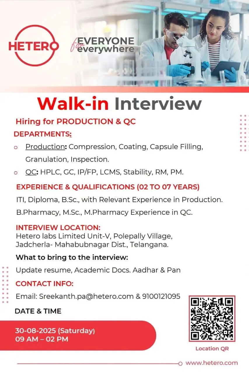 Walk-in drive at Hetero Labs, Telangana for Production & QC roles. 2–7 yrs experience. Attend on 30th Aug 2025. Apply today!