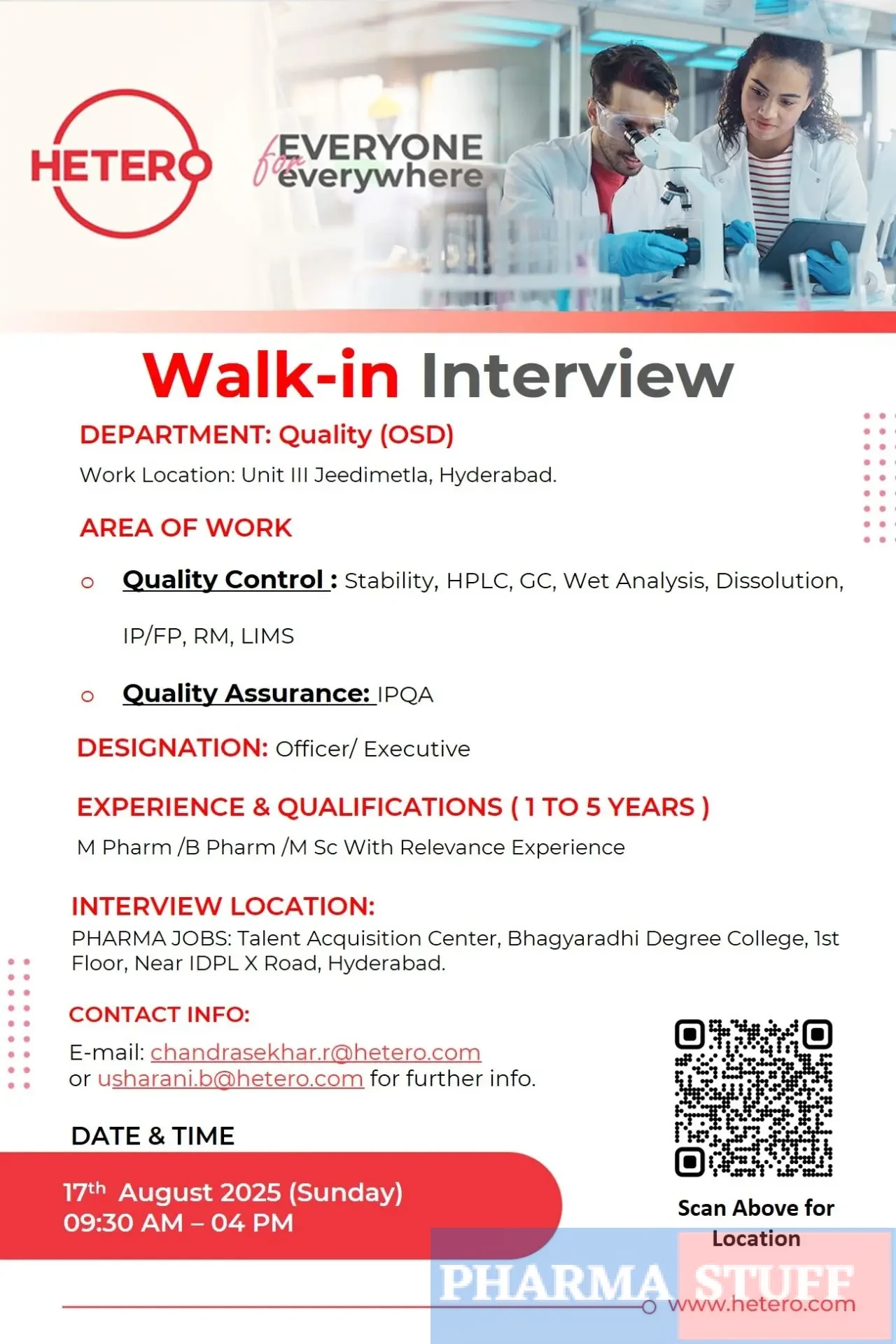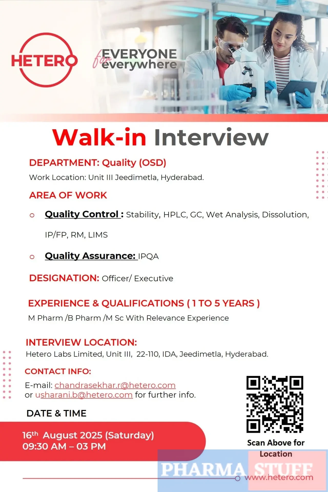 Hetero Labs Limited, a leading pharmaceutical company in India, is inviting qualified professionals to join its Quality Control (QC) and Quality Assurance (QA) teams at Unit III, Jeedimetla, Hyderabad. This walk-in recruitment drive is a great opportunity for candidates with M.Pharm, B Pharm, or MSc qualifications and 1–5 years of relevant experience in the pharmaceutical industry.