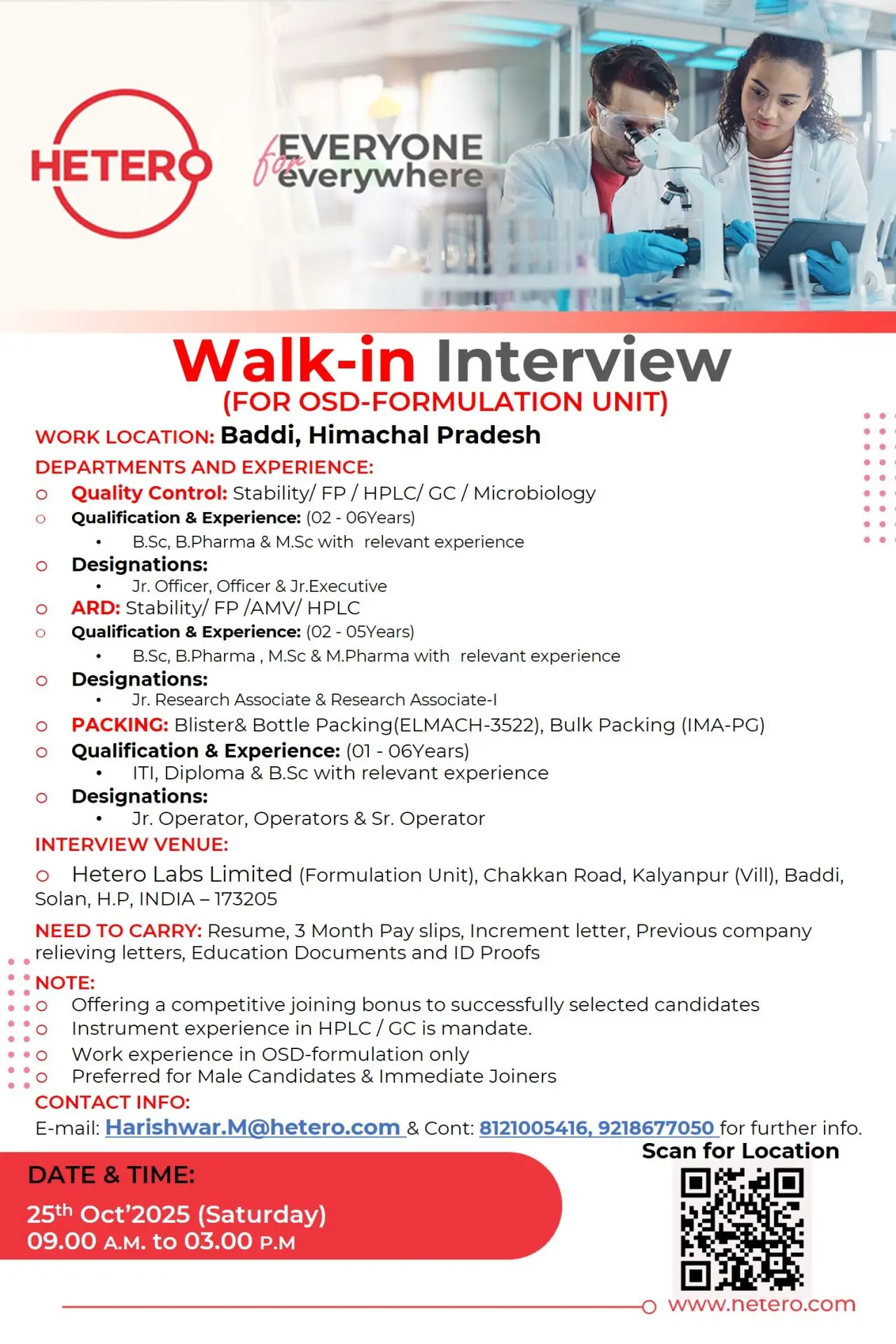 India’s leading pharmaceutical company, Hetero Labs Limited, is inviting experienced pharma professionals to attend a Walk-in Interview for various departments in its OSD Formulation Unit at Baddi, Himachal Pradesh. This is an excellent opportunity for candidates with relevant experience in Quality Control, Analytical R&D, and Packing operations to grow with one of the most respected pharma manufacturers.