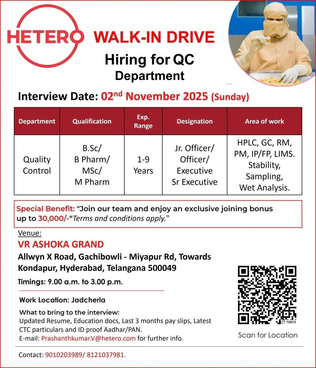 Hetero, one of India’s leading pharmaceutical companies, invites talented professionals to join its Quality Control team. This is your chance to work with one of the top innovators in API and formulation manufacturing. The walk-in drive offers multiple openings across analytical domains with a lucrative joining bonus of up to ₹30,000!