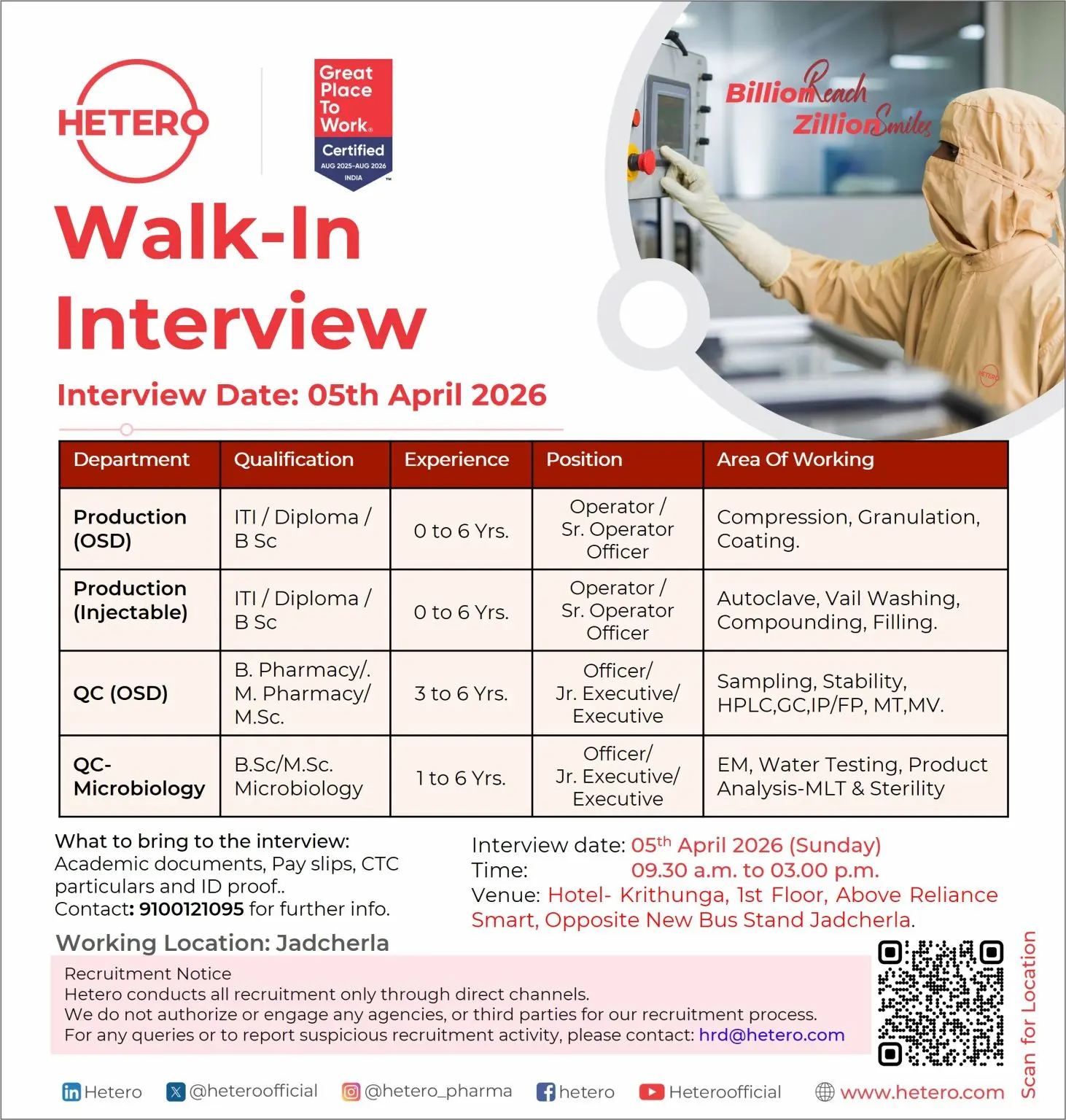 Hetero, a globally recognized pharmaceutical company and Great Place to Work certified organization, has announced a major walk-in interview drive for its Jadcherla facility. The company is hiring across multiple departments including Production (OSD & Injectable), Quality Control (QC), and Microbiology. Open positions include Operator, Sr. Operator, Officer, Jr. Executive, and Executive roles for candidates with 0 to 6 years of experience.