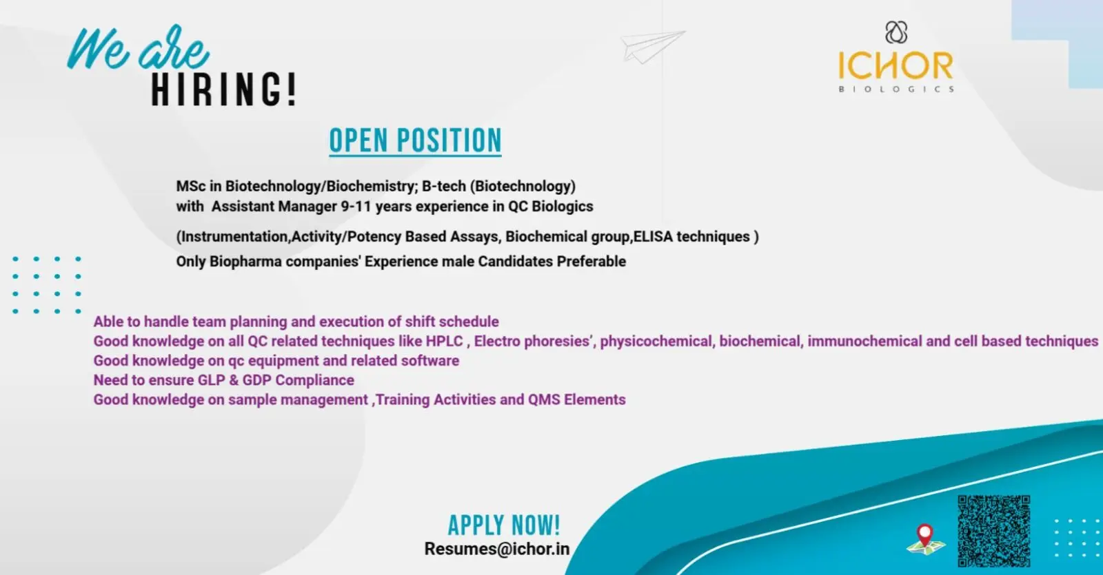 Apply for Assistant Manager QC role at Ichor Biologics, Hyderabad. M.Sc/B.Tech in Biotechnology with 9–11 years QC Biologics experience.