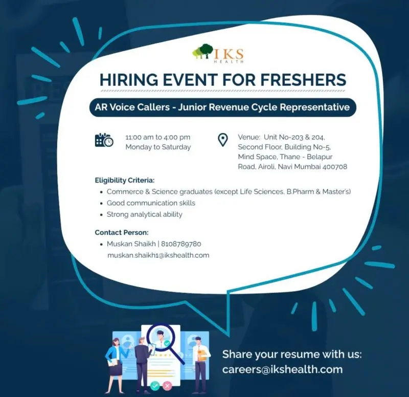 Hiring AR Voice Callers for Commerce & Science freshers in Navi Mumbai. Multiple vacancies. Walk-in Monday to Saturday.
