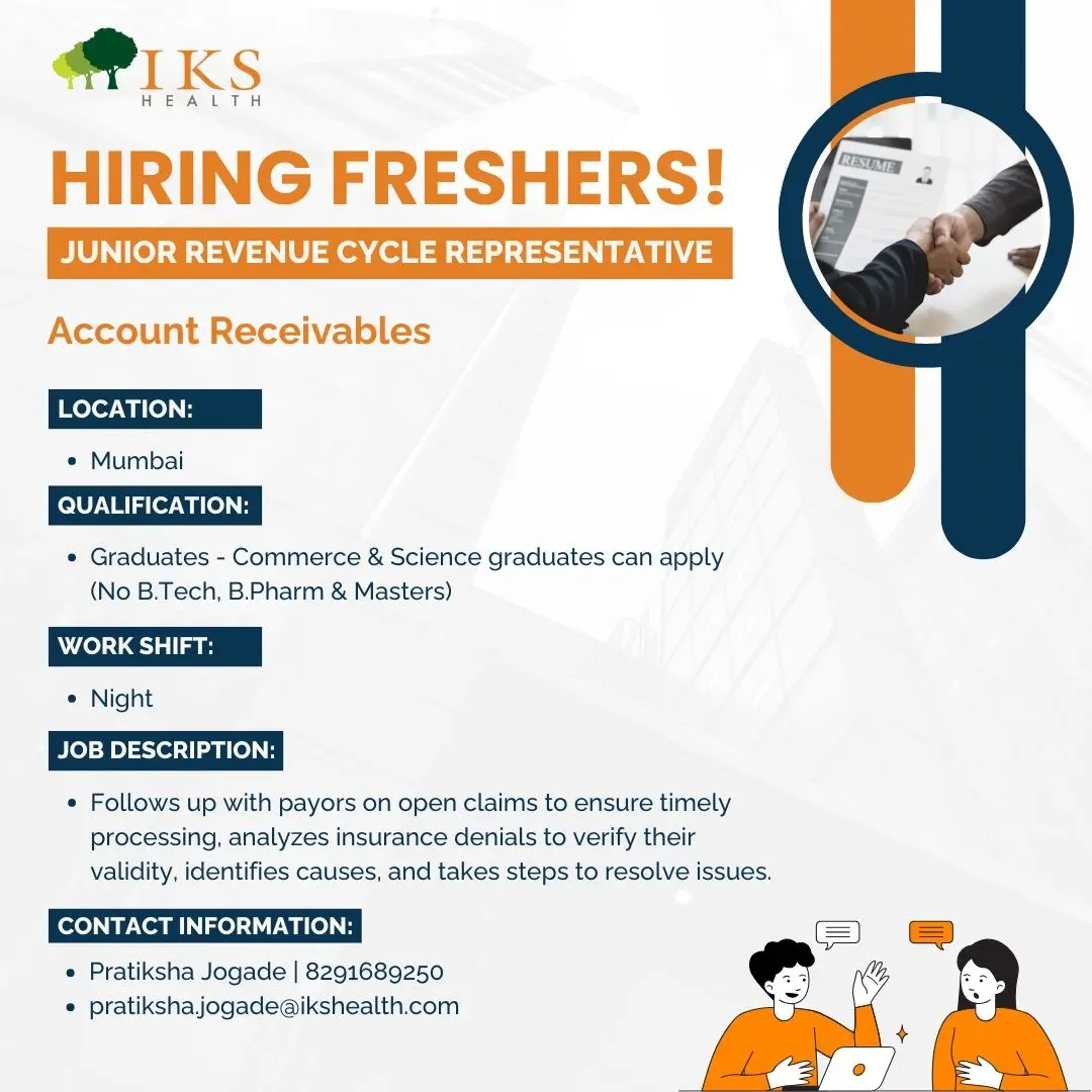 IKS Health, a leading healthcare solutions company, is inviting fresh graduates to join its Mumbai team as Junior Revenue Cycle Representatives. This is a great opportunity for Commerce and Science graduates to start a professional career in medical billing and healthcare revenue cycle management (RCM) — one of the fastest-growing sectors in the healthcare industry.