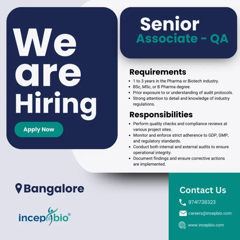 BSc, MSc, BPharm candidates – Senior Associate QA vacancy at IncepBio Bangalore. 1–3 years pharma or biotech experience required.