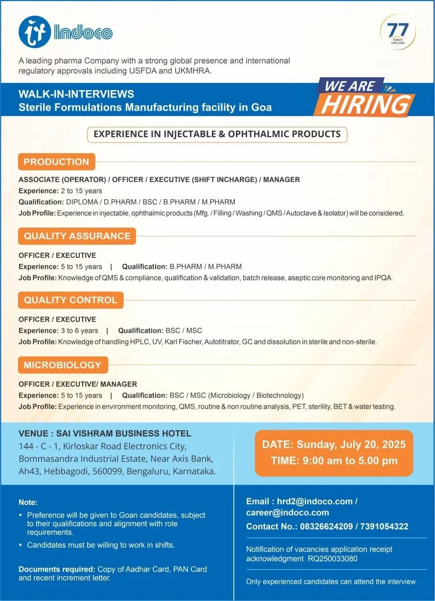 Indoco Remedies Ltd., a global pharmaceutical company approved by international regulatory bodies like USFDA and UKMHRA, is expanding its sterile formulation manufacturing unit in Goa. Candidates with a background in injectable and ophthalmic formulations now have an exciting opportunity to advance their pharma careers.