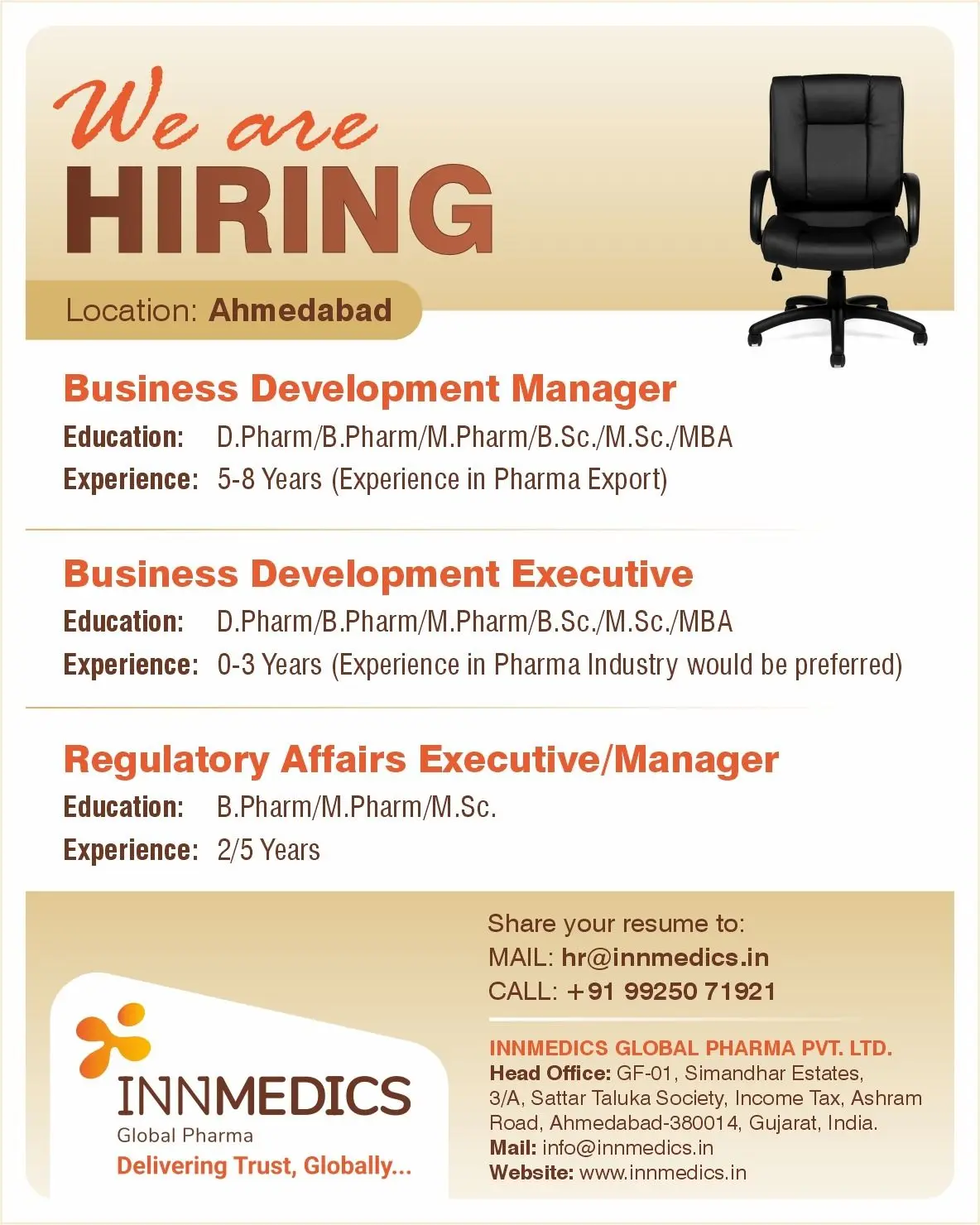 Apply now for 8+ pharma vacancies at Innmedics Global Pharma, Ahmedabad. Openings in Business Development & Regulatory Affairs.