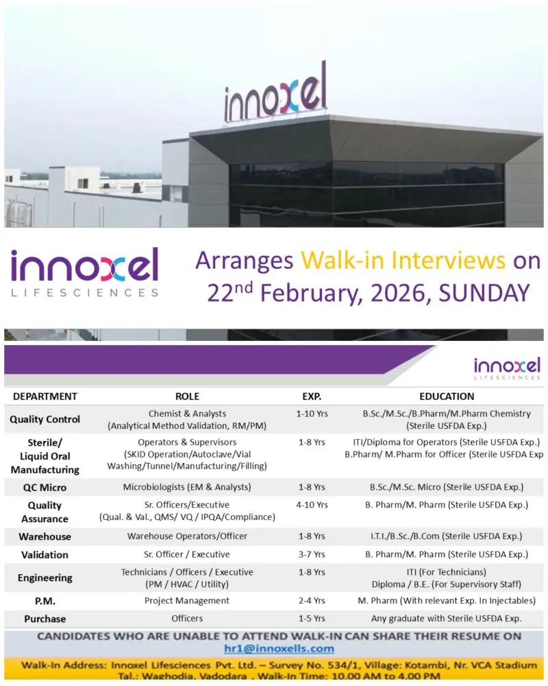 Innoxel Lifesciences Pvt. Ltd. is conducting a large-scale walk-in drive for multiple pharmaceutical manufacturing and quality roles. If you have experience in sterile USFDA-regulated facilities and want stable growth in injectable manufacturing, quality assurance, validation, engineering, or warehouse operations, this is a serious opportunity. The company is hiring across departments including Quality Control, Sterile Manufacturing, QC Microbiology, Quality Assurance, Warehouse, Validation, Engineering, Project Management, and Purchase.