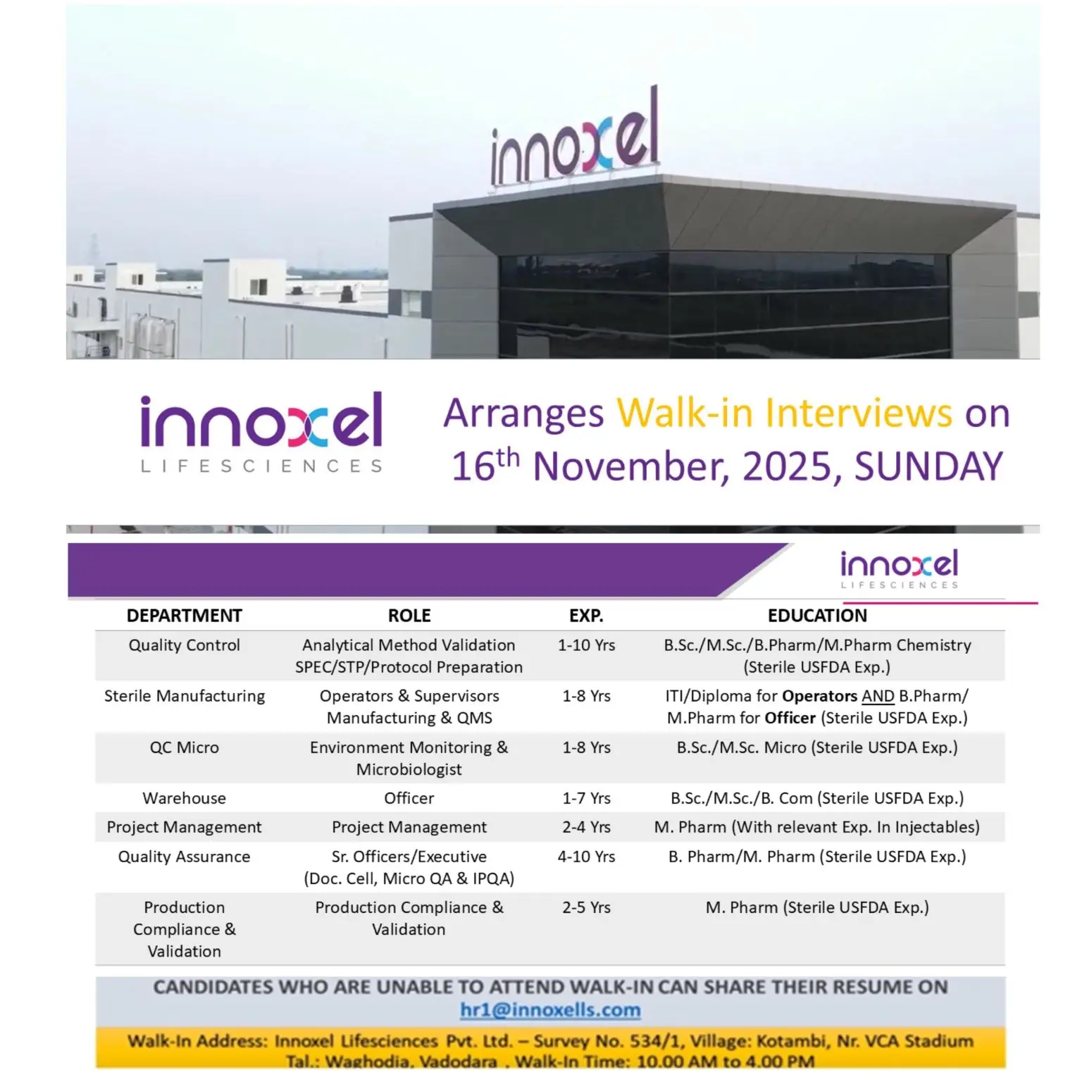 Walk-in interviews at Innoxel Lifesciences, Vadodara for QC, QA, and Sterile Manufacturing roles. Apply with 1–10 yrs experience in USFDA-approved facility.