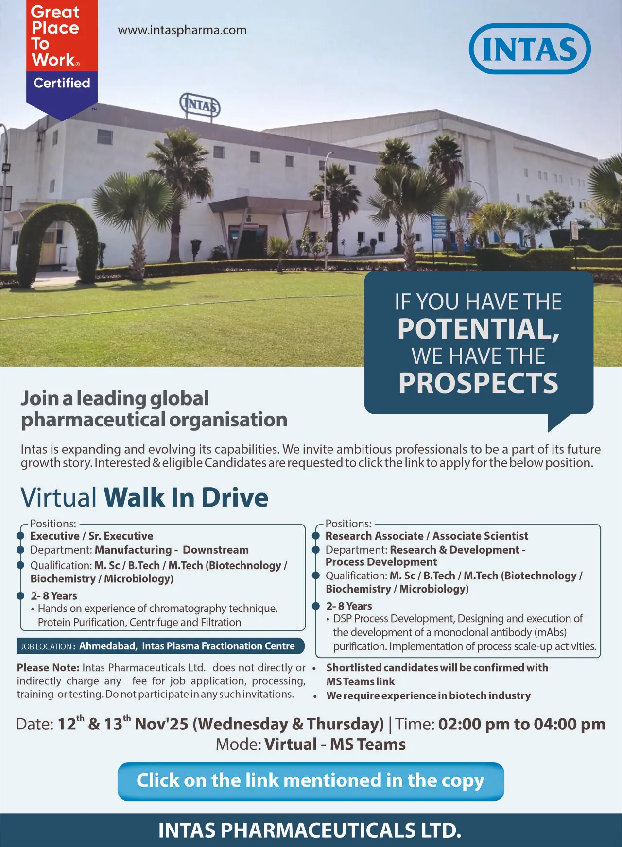 Intas Pharma hiring Executives & Research Associates in Biotech Manufacturing & R&D. M.Sc/B.Tech/M.Tech, 2–8 yrs exp. Virtual Walk-in 12–13 Nov.