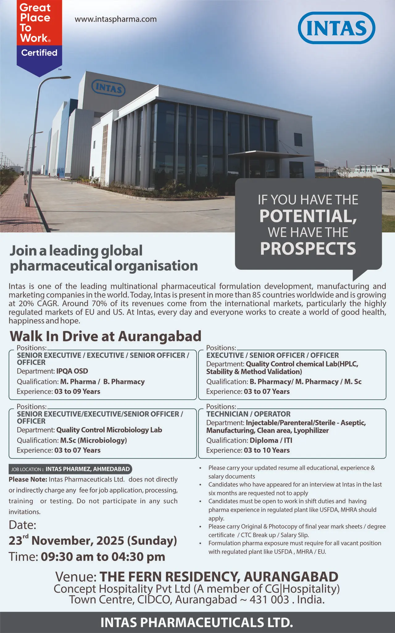 Intas hiring B.Pharm/M.Pharm/M.Sc professionals for IPQA, QC Microbiology, QC Chemical & Technician roles. Walk-in Aurangabad on 23 Nov 2025.