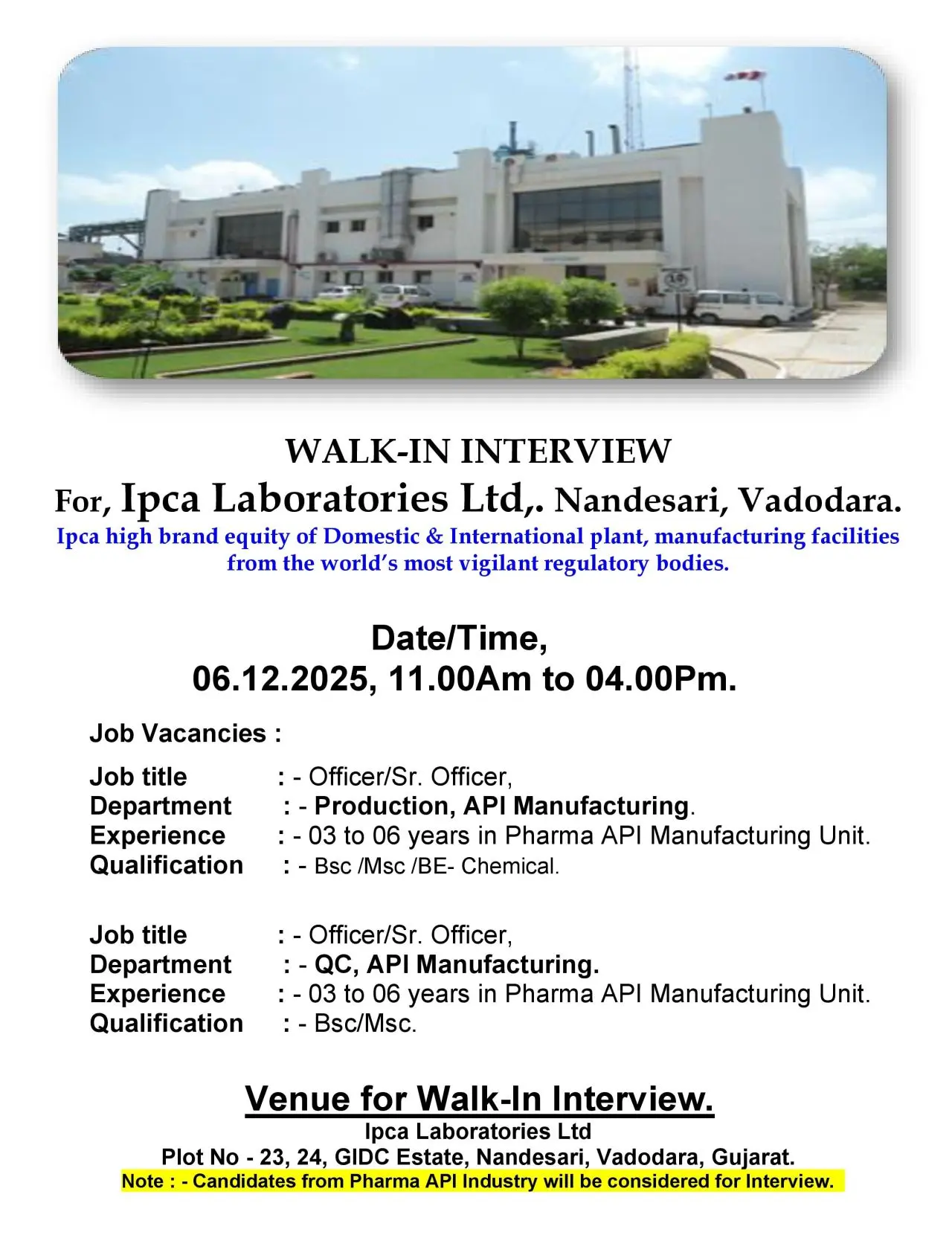 Ipca Laboratories Ltd., Nandesari, Vadodara, is conducting a walk-in interview for experienced professionals in API Production and API Quality Control. These openings are best suited for candidates with strong process knowledge, analytical discipline, and hands-on experience in API manufacturing environments inspected by global regulatory agencies. Only candidates from API backgrounds will be considered.