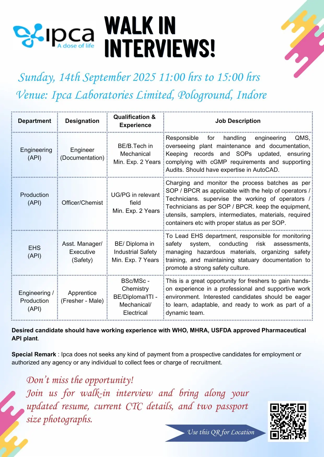 Attend Ipca Laboratories walk-in on 14 Sept 2025 at Indore. Openings in API Engineering, Production, EHS & Apprenticeships. Apply now!
