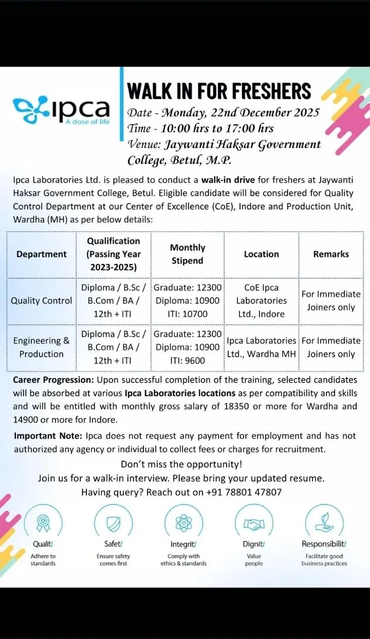 Ipca Laboratories hiring freshers for QC & Production. Diploma, BSc, ITI eligible. Walk-in at Betul on 22 Dec 2025.
