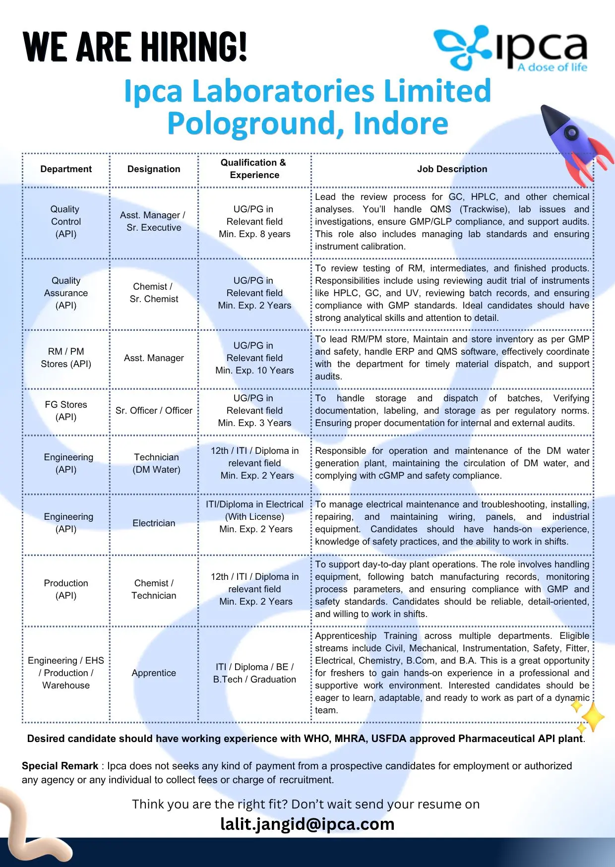 Whether you’re a fresher or experienced professional in the pharmaceutical or engineering field, Ipca is offering roles in QC, QA, Production, Engineering, Warehouse, and more.