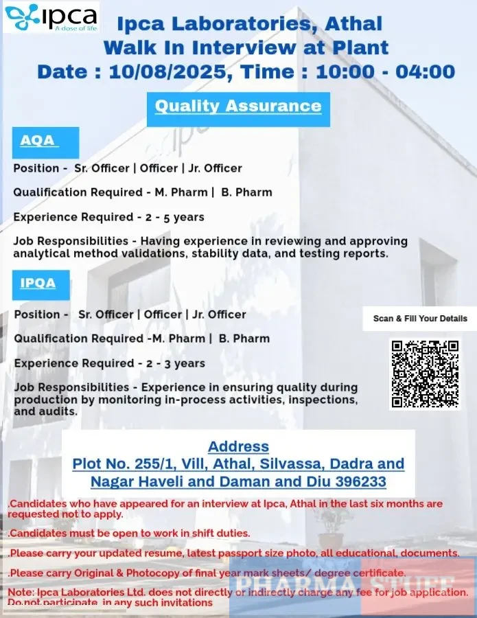 Explore multiple QA vacancies at Ipca Laboratories, Athal for M.Pharm/B Pharm graduates. Walk-in interview on 10/08/2025. Apply now for roles in AQA & IPQA with 2–5 years experience.