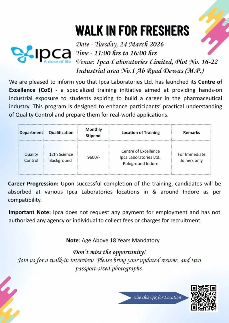 Ipca Laboratories Limited is conducting a walk-in drive for freshers under its newly launched Centre of Excellence (CoE) program. This is a rare opportunity for 12th Science candidates to enter the pharmaceutical industry through structured training in the Quality Control department.