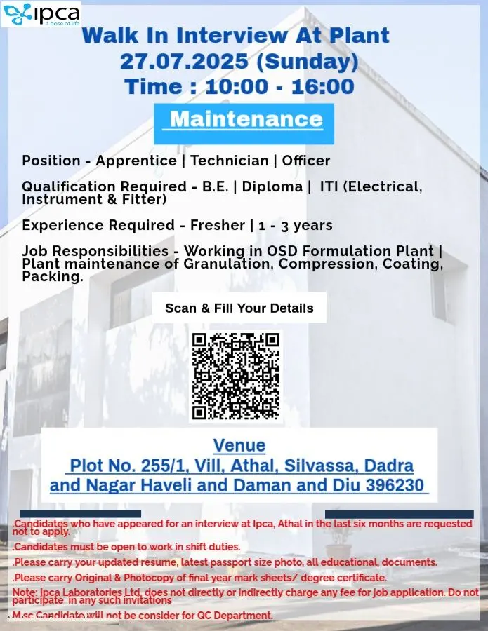 Walk-in drive at Ipca Laboratories Ltd for Apprentice, Technician & Officer roles in Maintenance department at Silvassa. Openings for B.E., Diploma, and ITI candidates. Freshers and 1–3 years experience eligible